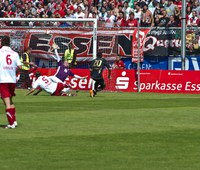 (Hamdi Dahmani erzielt die Führung gegen Rot-Weiß Essen, der Essener Torwart hat keine Chance, Foto: Gert König)