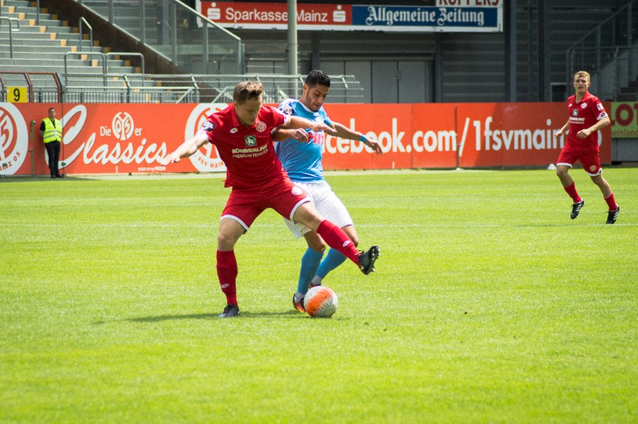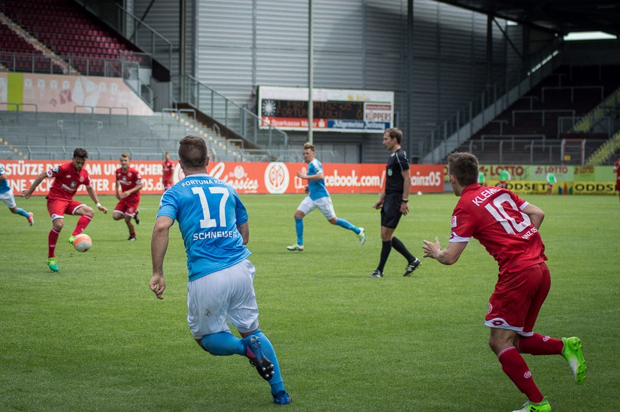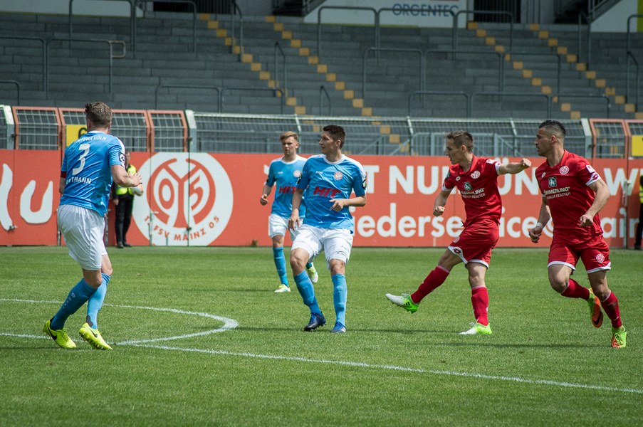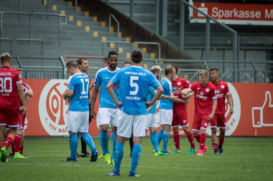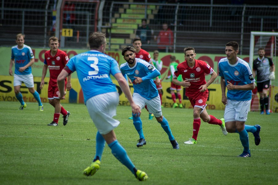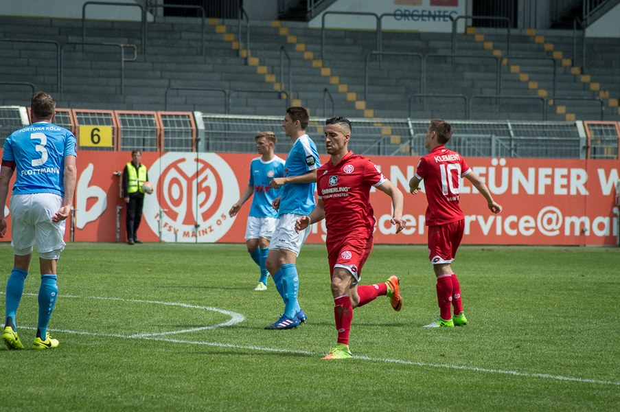 Vor dem Spiel stand der Klassenerhalt für die Fortuna fest, während der Abstieg für die Mainzer U23 besiegelt war. Bei den Kölnern waren Kessel und Theisen gelbgesperrt, sodass Stoffels zu seinem Drittliga-Startelfdebüt kam. Die Fortuna versuchte die Mainzer mit einer sehr mannorientieren Defensive zu überraschen. So hatten die Kölner nach einem Ballgewinn von Dahmani auch früh die Chance zur Führung. Der Stürmer scheiterte aber frei vor Watkowiak (4.). Trotzdem ging der Plan zunächst auf, Mainz fiel wenig ein. Einen Moment der Unachtsamkeit nutzte dann aber Klement, der aus 20 Metern humorlos abzog und Boss keine Chance ließ - 1:0 für Mainz (10.). Anschließend verflachte die Partie: Mainz ließ den Ball gekonnt durch die eigenen Reihen laufen, ohne für Torgefahr zu sorgen. Die Fortuna jagte hinterher, ohne nennenswerte Ballgewinne zu verbuchen. Einzig ein Solo von Souza und ein Schuss von Klement sorgten für Highlights (21./24.). Nach der ersten Mainzer Ecke hielt dann Bohl seinen Kopf in einen Schussversuch und ließ Boss so keine Chance - 2:0 für Mainz (27.). Durch das Tor bekam die U23 weiter Sicherheit in ihr Spiel, während die Fortuna gleichzeitig ratlos wirkte. So passierte herzlich wenig. Ein Kopfball von Bouziane in die Arme von Boss war noch das Nennenswerteste (40.). Kurz vor der Pause ließ Klement schließlich das 3:0 gegen Boss liegen (44.). So blieb es beim 0:2 aus Fortuna-Sicht.