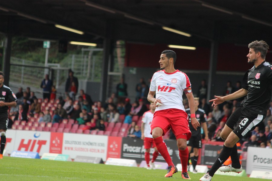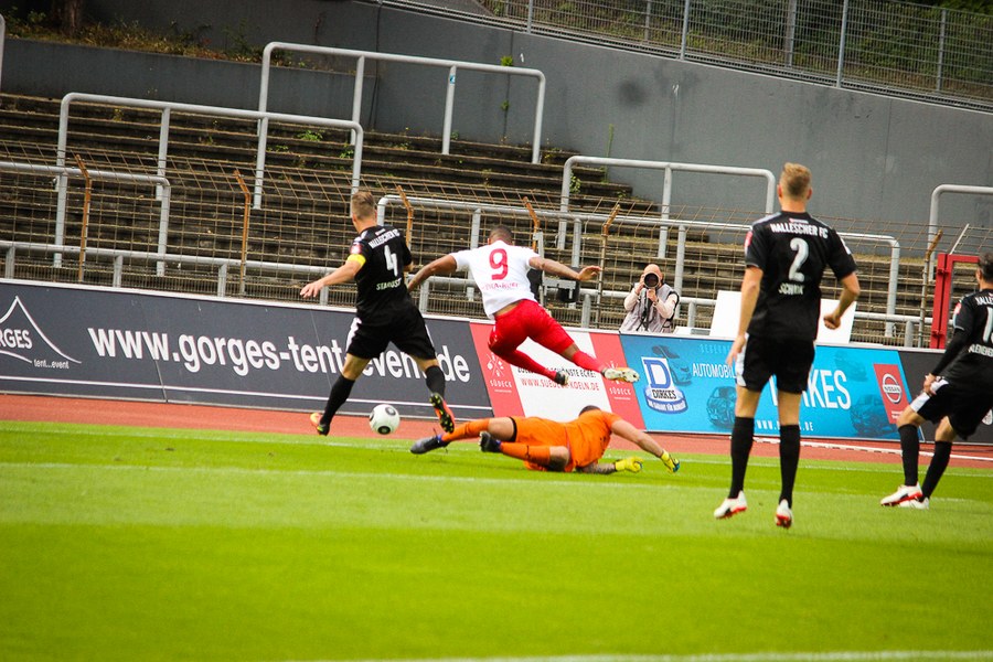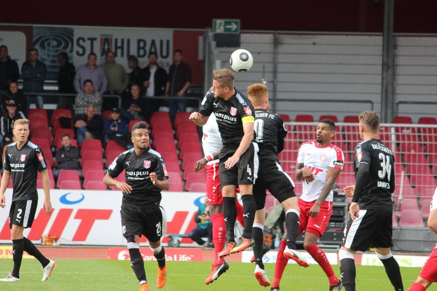 Nach dem zunächst hektischen Beginn flachte die Begegnung etwas ab. Die Fortuna versuchte immer wieder über schnelle Kombinationen vor den Kasten der Gäste zu kommen. Die Hallenser zogen sich in der Folge immer weiter zurück und überließen den Gastgebern das Spielgeschehen. Nach einer längeren Ruhephase kam dann plötzlich Scheu (24.) zu einem gefährlichen Abschluss. Die Chance fungierte als Wachmacher für die Fortuna, die in Person von Keita-Ruel zu zwei weiteren Großchancen kamen. Kleineheismann und wieder Schnitzler klärten aber zwei mal in allerhöchster Not (26.).