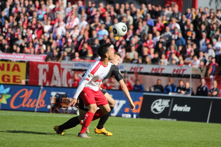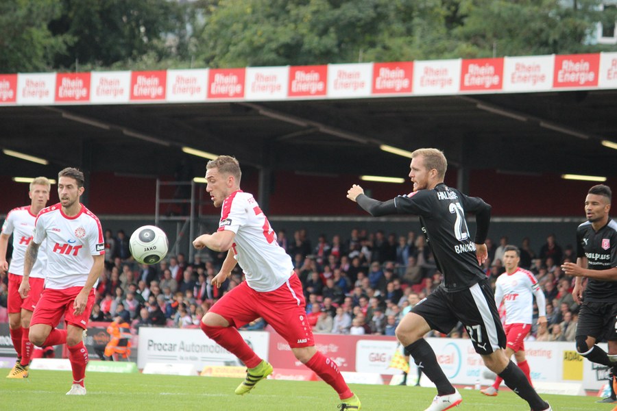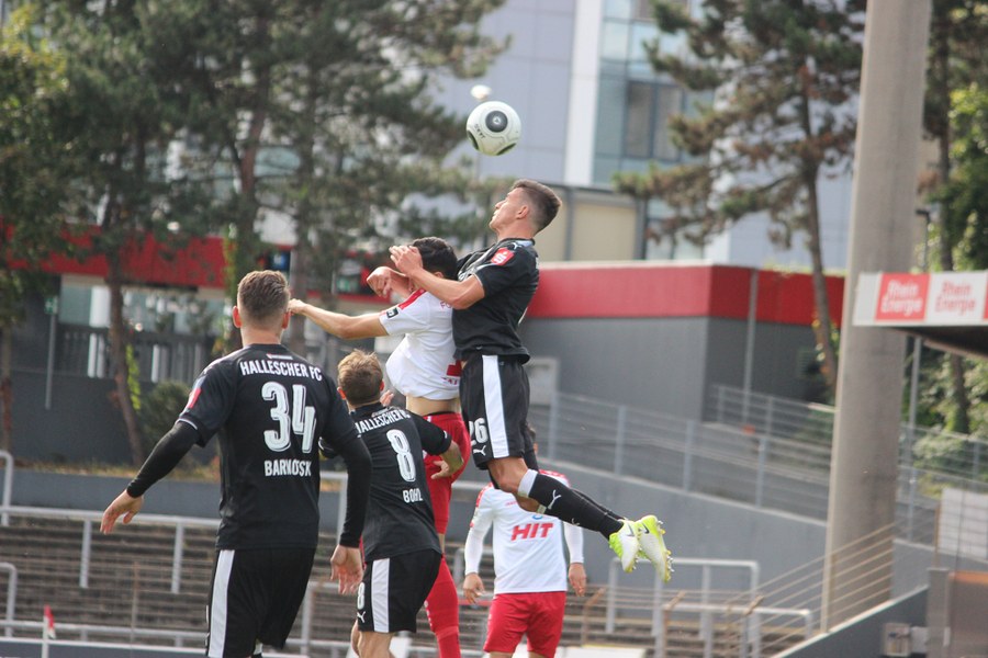 Halle machte gleich von Beginn an Druck und schockte die Fortuna früh. Nach einem Missverständnis in der Fortuna-Abwehr kam El-Helwe an den Ball und versenkte gegen Tim Boss eiskalt. Die Fortuna zeigte sich allerdings nicht lange geschockt und versuchte schnell zu antworten. Dahmani (7.) und Keita-Ruel (8.) scheiterten jedoch an Keeper Schnitzler. Nur kurze Zeit später glichen die Südstädter dann aber aus. Dabei zeigte sich einmal mehr die Standardstärke der Kölner: Kegel flankte einen Freistoß von der rechten Seite an den Fünfer, wo Brandenburger frei einköpfte (10.).