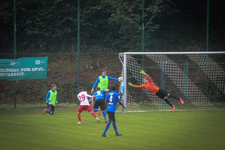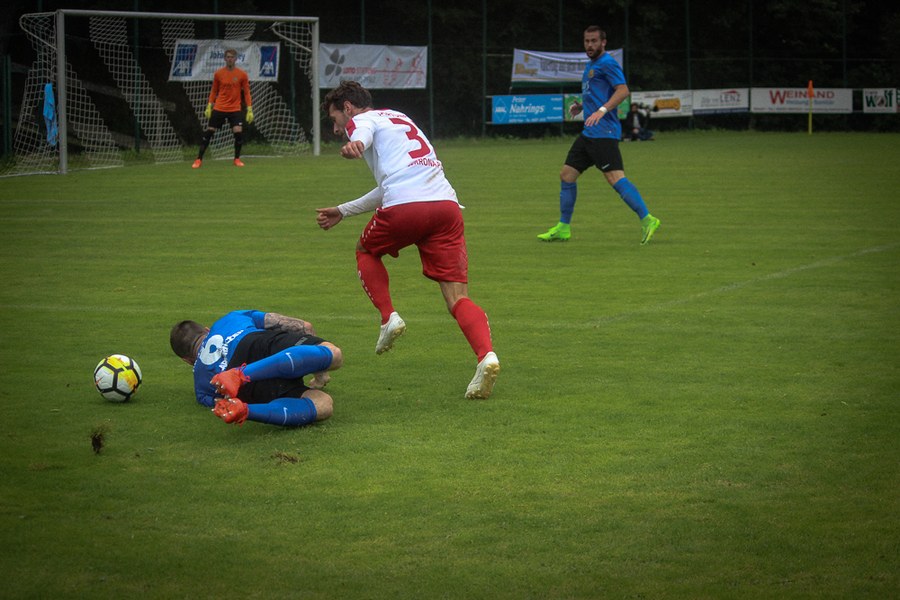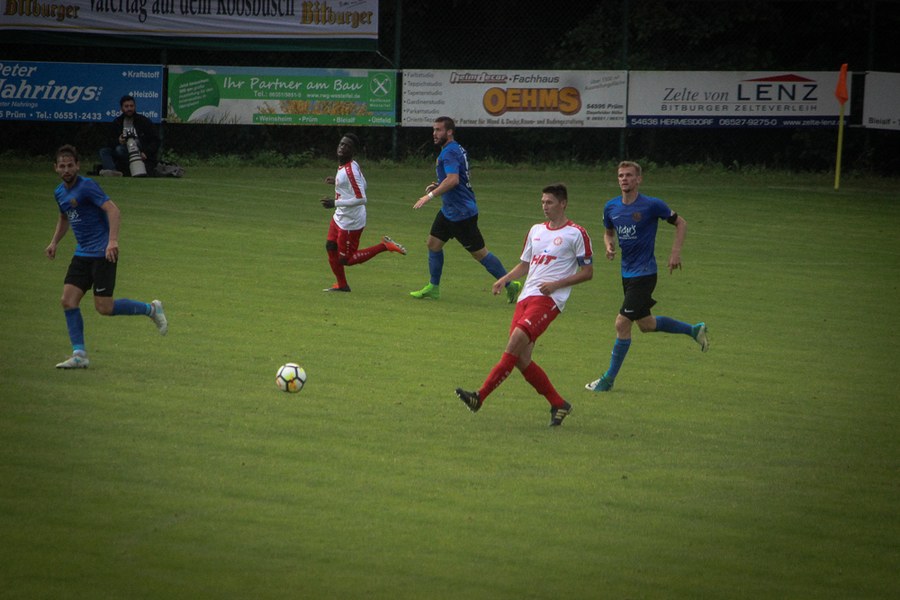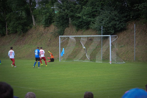 Lange Bälle bestimmten die Anfangsphase der Partie, beide Mannschaften tasteten sich erst mal ab. Maik Kegel hatte dann in der 4. Minute die erste Chance des Spiels, sein Freistoß aus 25 Metern ging aber über das Tor von Keeper Batz.