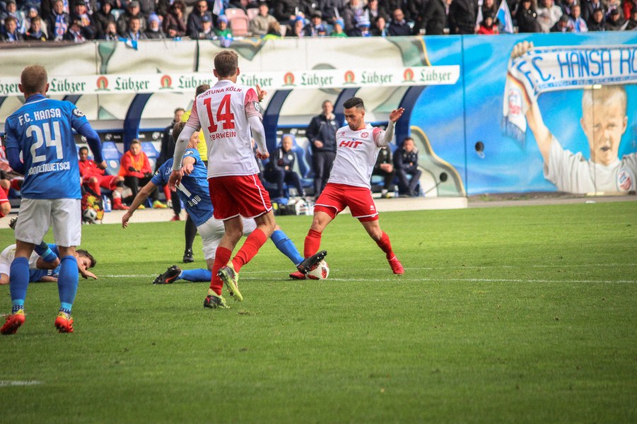 Ohne Wechsel ging es in den zweiten Abschnitt, der in ruhigerem Tempo begann. Breier und Hartmann probierten sich für ihre Farben jeweils mit einem Abschluss (50./55.). Rostock nahm einen Gang raus aus der Partie, ließ die Offensive der Fortuna aber nicht zur Entfaltung kommen. Trotzdem war man dem nächsten Tor in Person des wuseligen Biankadi näher, der aber an Rehnen scheiterte (66.). Dann meldete sich die Elf von André Filipovic aber endgültig in der Partie an: Einen Freistoß von der Stafraumkante brachte Kegel im Tor unter (69.). Der Anschlusstreffer hauchte der Fortuna spürbar neues Leben ein: Scheu scheiterte kurz darauf aus spitzem Winkel am Außennetz (71.). Hansa blieb zunächst passiv, während die Fortuna mutiger wurde und auch über die Innenverteidiger Kyere und Uaferro immer wieder anschob. Es gelangen nun auch vermehrt die Kombinationen in der Offensive, sodass man sich in Hansas Hälfte festsetzte. Zu selten kamen die Kölner aber gefährlich in den Rostocker Strafraum, auch wenn Eberwein eine Schiek-Flanke kurz vor Schluss aus kurzer Distanz verpasste (82.). So blieb es letztlich beim 3:1-Heimsieg für Hansa Rostock.