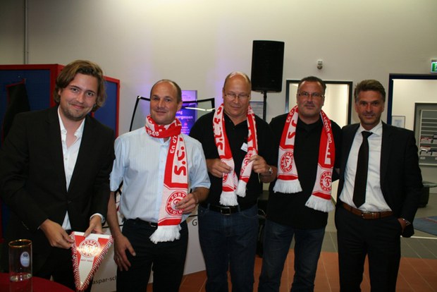 (Dirk Daniel Stoeveken, Ralf Nahrendorf (Geschäftsführer Autoglas Colonia), André Herbrand (Geschäftsführer junited AUTOGLAS Deutschland), Ralf Koeppe (Marketinggleiter) und Hanns-Jörg Westendorf (2. Vorsitzender Fortuna Köln e.V.) freuen sich über die gelungene Veranstaltung, Foto: Thielen)