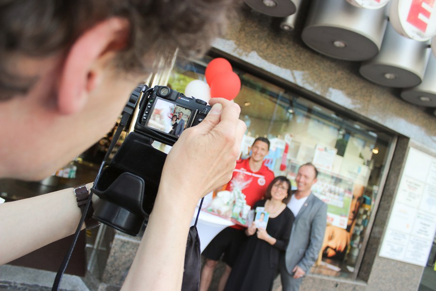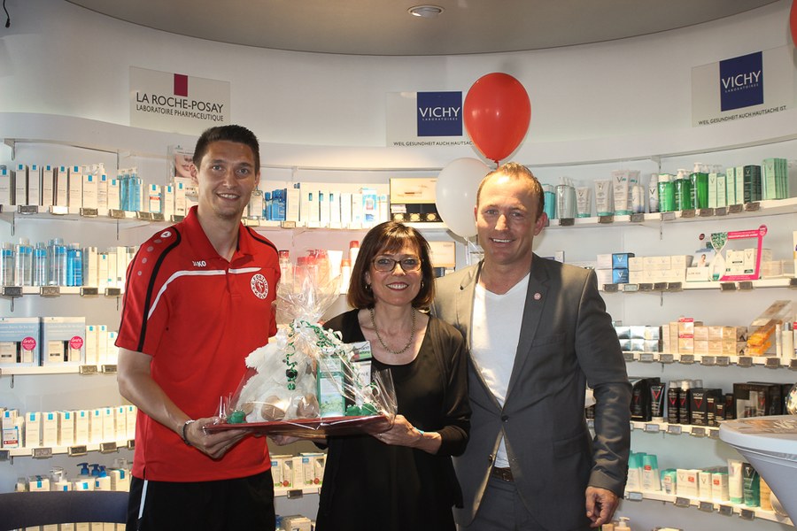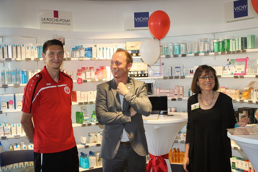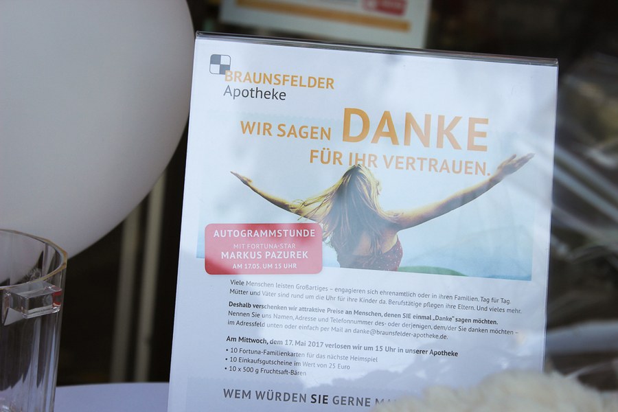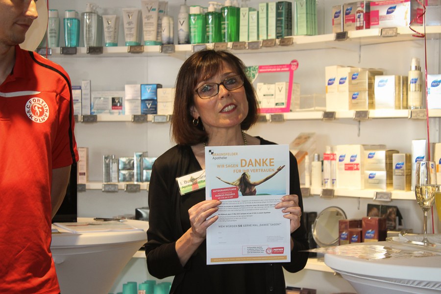 Unter dem Motto "Danke sagen" erschien Fortuna-Mittelfeldstar Markus Pazurek am 17.05 zur Autogrammstunde in der Braunsfelder Apotheke. Benjamin Bruns, Mitglied der Geschäftsleitung bei Fortuna Köln, übergab an Apothekenleiterin Ines Buschmann den Hauptpreis der Gewinnspiel-Verlosung: Zehn Gutscheine für Familientickets zum ersten Fortuna-Heimspiel in der kommenden Saison. Kunden können außerdem zehn Apotheken-Einkaufsgutscheine im Wert von 25 Euro, sowie 10x500 Gramm Fruchtsaft-Bären gewinnen.