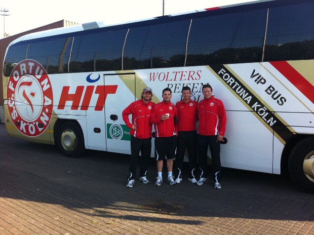 Jonas Sela, Kevin Kruth, Dirk Caspers und Steffen Moritz haben es sich trotz der frühmorgendlichen Abfahrt nach Kaiserslautern nicht nehmen lassen, ein Foto vor dem "neuen" Mannschaftsbus der Fortuna zu machen. Dank des Hauptsponsors HIT und natürlich der Kölner Busreisefirma Wolters wurde die Sommerpause genutzt, um dem Mannschaftsbus der Fortuna ein eigenes Gesicht zu geben. Damit ist die Fortuna nun auf allen Auswärtsfahrten nun schon von weitem zu erkennen.