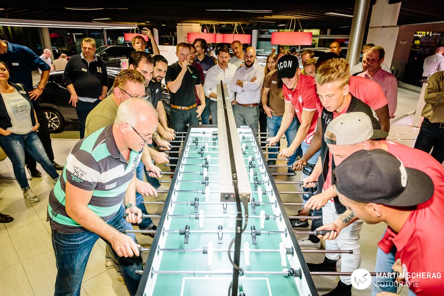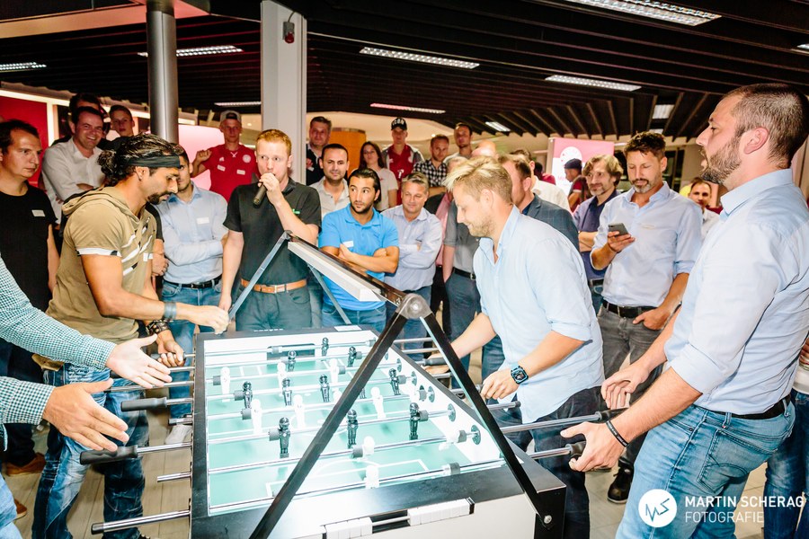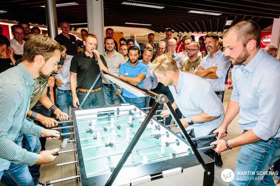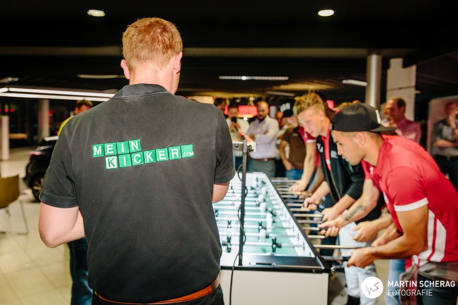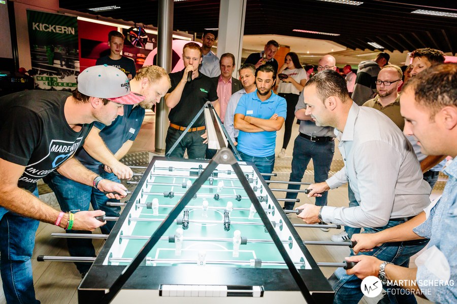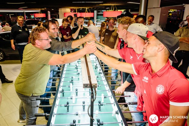 Am Donnerstagabend öffnete der langjährige Fortuna-Partner Autohaus Dirkes die Pforten seines Showrooms, in dem das diesjährige Kicker-Turnier zum dritten Mal in Folge ausgetragen werden sollte. Schon bevor die erste Spielrunde des Turniers eröffnet wurde, konnten sich die anwesenden Vertreter der Partnerunternehmen bereits an den von meinkicker.com aufgestellten Tischkickern einspielen oder sich einfach bei kühlen Getränken von Fortuna-Partnern Gaffel und Coca-Cola untereinander vernetzen. Gemeinsam mit Elmar Vogel, Leiter Marketing Automobilgruppe Dirkes GmbH eröffnete Benjamin Bruns, Leiter Sponsoring und Vertrieb Fortuna Köln offiziell den Abend. Ihm zur Seite standen auch die Fortuna-Profis Bernard Kyere, Okan Kurt, Dominik Ernst, Nico Brandenburger und auch der zur Zeit verletzte Innenverteidiger Moritz Fritz ließ sich den Spaß an diesem Abend nicht nehmen. Die insgesamt 44 teilnehmenden Mannschaften spielten in fünf Spielrunden à fünf Minuten um die Teilnahme an der Endrunde. Zwar gab es an manchen Tischen deutliche Ergebnisse, doch bereits in der Vorrunde wurden viele Duelle erst kurz vor Ende der Spielzeit entschieden. Nach Abschluss der Vorrunde zogen die besten 16 Teams in die Endrunde ein. Unter ihnen fand sich auch das Fortuna-Duo Kurt und Fritz wieder, die eine überzeugende Leistung in den ersten fünf Spielen zeigten und sich die Teilnahme an den K.O.-Spielen verdient hatten. Im Achtelfinale schieden die beiden Profis aber aus. Um die anwesenden Tischfußballer kulinarisch zu versorgen und bei Kraft zu halten, bereitete das Team von Mad Dogs diverse Hot-Dog-Variationen vor. Einen verdienten 3. Platz erkämpfte sich das Team von Pixum. In einem packenden Finale, das erst drei Sekunden vor Schluss in der Verlängerung entschieden wurde, setzte sich der Favorit und mermalige Sieger ADAC Nordrhein gegen das Team von Bodystreet durch. Mit großer Freude nahmen die Verteter des ADAC die Eintrittskarten für die Championsleague-Partie zwischen Borussia Dortmund und Atlético Madrid entgegen. Elmar Vogel und Benjamin Bruns zeigten sich in ihren Abschlussworten hochzufrieden mit dem Ablauf und der Organisation des "Wunders von Ehrenfeld 3.0" und freuten sich über die im Vergleich zum letzten Jahr gestiegenen Teilnehmerzahl.