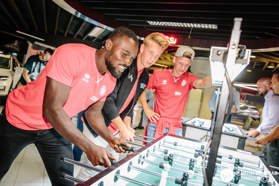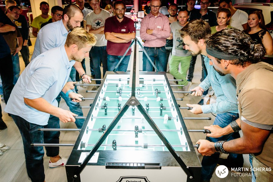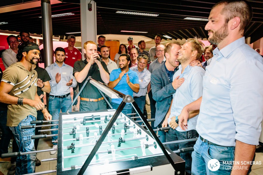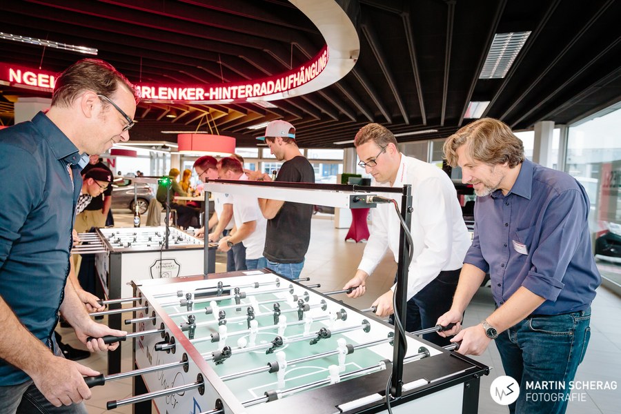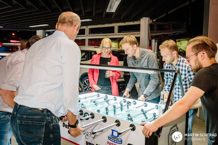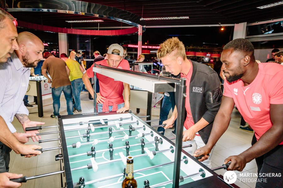 Am Donnerstagabend öffnete der langjährige Fortuna-Partner Autohaus Dirkes die Pforten seines Showrooms, in dem das diesjährige Kicker-Turnier zum dritten Mal in Folge ausgetragen werden sollte. Schon bevor die erste Spielrunde des Turniers eröffnet wurde, konnten sich die anwesenden Vertreter der Partnerunternehmen bereits an den von meinkicker.com aufgestellten Tischkickern einspielen oder sich einfach bei kühlen Getränken von Fortuna-Partnern Gaffel und Coca-Cola untereinander vernetzen. Gemeinsam mit Elmar Vogel, Leiter Marketing Automobilgruppe Dirkes GmbH eröffnete Benjamin Bruns, Leiter Sponsoring und Vertrieb Fortuna Köln offiziell den Abend. Ihm zur Seite standen auch die Fortuna-Profis Bernard Kyere, Okan Kurt, Dominik Ernst, Nico Brandenburger und auch der zur Zeit verletzte Innenverteidiger Moritz Fritz ließ sich den Spaß an diesem Abend nicht nehmen. Die insgesamt 44 teilnehmenden Mannschaften spielten in fünf Spielrunden à fünf Minuten um die Teilnahme an der Endrunde. Zwar gab es an manchen Tischen deutliche Ergebnisse, doch bereits in der Vorrunde wurden viele Duelle erst kurz vor Ende der Spielzeit entschieden. Nach Abschluss der Vorrunde zogen die besten 16 Teams in die Endrunde ein. Unter ihnen fand sich auch das Fortuna-Duo Kurt und Fritz wieder, die eine überzeugende Leistung in den ersten fünf Spielen zeigten und sich die Teilnahme an den K.O.-Spielen verdient hatten. Im Achtelfinale schieden die beiden Profis aber aus. Um die anwesenden Tischfußballer kulinarisch zu versorgen und bei Kraft zu halten, bereitete das Team von Mad Dogs diverse Hot-Dog-Variationen vor. Einen verdienten 3. Platz erkämpfte sich das Team von Pixum. In einem packenden Finale, das erst drei Sekunden vor Schluss in der Verlängerung entschieden wurde, setzte sich der Favorit und mermalige Sieger ADAC Nordrhein gegen das Team von Bodystreet durch. Mit großer Freude nahmen die Verteter des ADAC die Eintrittskarten für die Championsleague-Partie zwischen Borussia Dortmund und Atlético Madrid entgegen. Elmar Vogel und Benjamin Bruns zeigten sich in ihren Abschlussworten hochzufrieden mit dem Ablauf und der Organisation des "Wunders von Ehrenfeld 3.0" und freuten sich über die im Vergleich zum letzten Jahr gestiegenen Teilnehmerzahl.