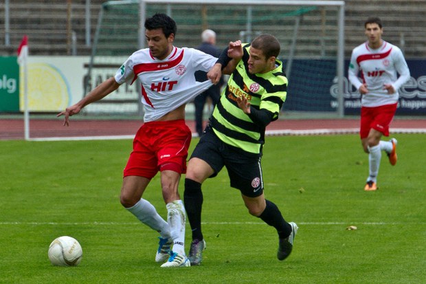 (Ozan Yilmaz - hier im Spiel gegen Mainz 05 - erzielte die frühe Führung für die Fortuna, musste wenig später aber verletzt den Platz verlassen, Foto: Gert König)