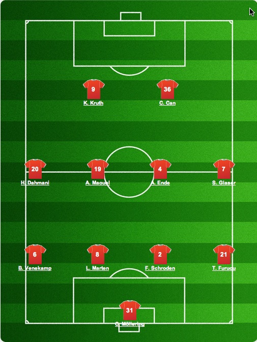 Die Co-Trainer von deinfussballclub.de haben sich einmal mehr für die 4-4-2-Formation entschieden. Gegen den SV Bergisch-Gladbach sollen Kevin Kruth und Cengiz Can gemeinsam auflaufen, um die Gladbacher vom Anpfiff an unter Druck zu setzen. Wie die Planungen von Matthias Mink aussehen und welches Team er aufs Feld schickt, erfahrt Ihr im DFC-Chat um 17 Uhr. Direkt in den Chat gelangt Ihr hier.
