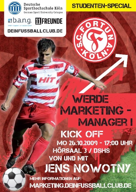 Die deinfussballclub.de DFC GmbH kooperiert ein Mal mehr mit der Deutschen Sporthochschule Köln. Die Zusammenarbeit, die sich bisher auf die leistungsdiagnostischen Tests vor der Spielzeit beschränkt, wird nun deutlich erweitert. Gemeinsam mit der Kölner Agentur B.A.N.G und natürlich dem sportlichen Berater Jens Nowotny werden ab heute interessierte Studentinnen und Studenten gesucht, die Spaß daran haben, innovative Marketingkonzepte für Fortuna Köln zu entwickeln. Die Auftaktveranstaltung findet heute um 17 Uhr in der Deutschen Sporthochschule statt.