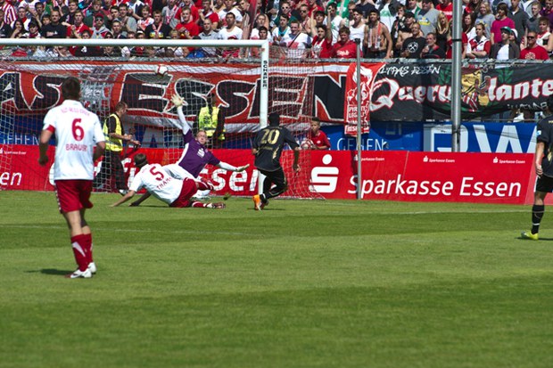 (Hamdi Dahmani erzielt die Führung gegen Rot-Weiß Essen, der Essener Torwart hat keine Chance, Foto: Gert König)