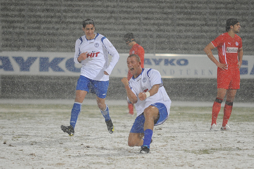 Es gibt Fussballspiele, die vergisst man nicht. Das 3:3-Unentschieden im Spiel gegen die Sportfreunde Siegen war so eines - und das nicht nur wegen des nervenaufreibenden Spielverlaufes. Zu Beginn des Spiels begann es zu schneien. Der Schneefall wurde immer dichter, so dass in der Halbzeit sogar diskutiert wurde, das Spiel abzubrechen. Den Zuschauern wären interessante und spannende 45 Minuten entgangen. Emrah Uzun hatte die Siegener in der 4. Minute in Front gebracht, Cengiz Can brachte - mit einem Doppelschlag Sekunden vor der Pause - die Fortuna in Führung. Direkt nach der verlängerten Halbzeitpause war es dann Daniel Cartus, der den Ausgleich erzielte. Eigentlich hatten sich alle schon mit einem Unentschieden abgefunden, als das Spiel Minuten vor dem Schluß dann doch noch mal dramatisch wurde. Neuzugang Sebastian Huke köpfte den Führungstreffer in der 88. Spielminute - und die Fortuna schlug doch noch zurück. Der eingewechselte Sascha Jagusch nutzte eine Unaufmerksamkeit des Siegener Torwarts und köpfte doch noch den vielumjubelten Ausgleich. Damit bleibt die Fortuna auch im fünften Spiel hintereinander ungeschlagen.