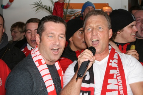 Fans, Mannschaft und "Die Kalauer" singen im Vereinsheim
