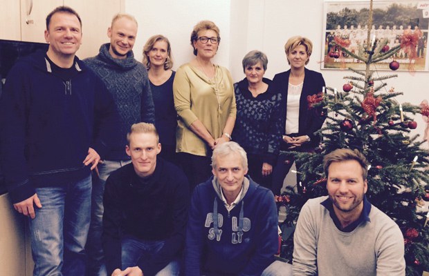 Bildunterschrift (v.l.n.r.): Chef- & Mannschafts­arzt Christoph Bruhns, Christian Osebold (Physiotherapeut Fortuna Köln), Frau Dr. Anne Jung, Frau Kattwinkel (Sekretariat), Frau Lauer (Sekretariat) und Frau Caspers (Sekretariat). Unten hockend: Thomas Kraus (Fortuna Köln), Herr Dr. Jochen Müller, Herr Dr. Björn Lindenthal