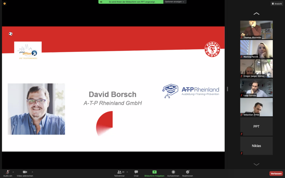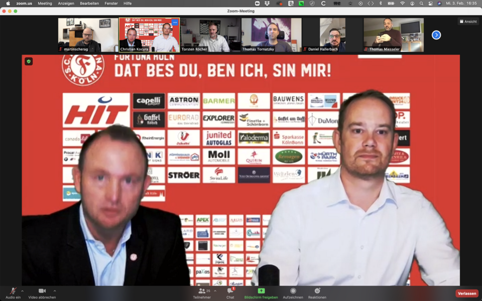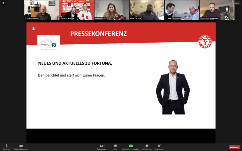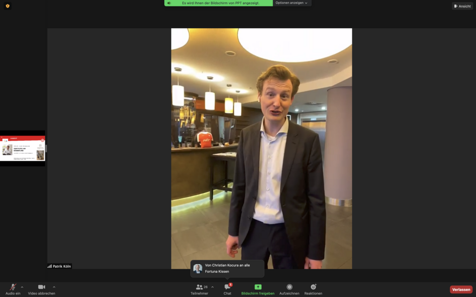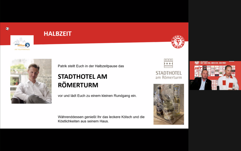 Rund 25 Teilnehmer nahmen am einem "Business-Speeddating" teil und nutzen die Gelegenheit, sich und ihr Unternehmen vorzustellen und andere Unternehmensvertreter in Einzelgesprächen kennen zu lernen. Fortuna-Geschäftsführer Benjamin Bruns und global office Geschäftsführer Christian Kocura führten gemeinsam durch den Abend. Als kleine Überraschung erwartete jeden Teilnehmer ein Paket des Stadthotels am Römerturm unter anderem gespickt mit Getränken der Privatbrauerei Gaffel.