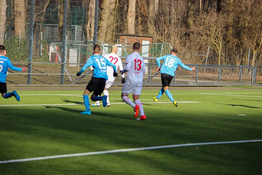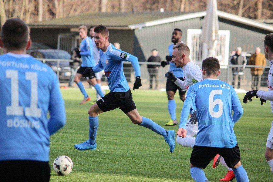 Vor knapp 50 Trainingskiebitzen entwickelte sich eine offene Anfangsphase. Die Fortuna versuchte im Block früh zu stören und schob durchaus hoch. Speziell über rechte Seite konnte Flottmann einige Ballgewinne provozieren. Danach suchte man den direkten Weg nach vorne. Es fehlte aber noch die Durchschlagskraft. Trotzdem enstanden aus Umschaltsiuationen die besten Szenen, als Bender nach einem schnellen Einwurf im Strafraum keinen Abnehmer fand und kurz darauf nach einem Konter über Souza Dahmani nicht zum Schuss kam (14./19.). Der FC ließ nach einem Fehler der Fortuna mit einem Schuss von Ban mal offensiv aufhorchen (21.). Die Südstädter wurde aber aktiver. Speziell Souza entwickelte sich zum Ativposten und versuchte auf Links Betrieb zu machen. Ein Freistoß des Südstadt-Brasilianers blieb aber das einzige Nennenswerte (28.). Stattdessen verbuchte der FC die beste Chance, als Hildebrandt nach einer Ecke am Pfosten scheiterte (32.). Danach wurde es ruhiger auf dem Feld, bis zur 42. Minute: Da kam der Regionalligist nach einem Ballgewinn in Person von Ban bis zur Strafraumkante. Der Ex-Fortune schloss trocken ab und legte den Ball direkt neben den Pfosten - keine Chance für Poggenborg. Die Fortuna hatte zwar die Chance zum schnellen Ausgleich, aber Flottmann köpfte eine Bender-Flanke vorbei. So blieb es beim 0:1 zur Pause.