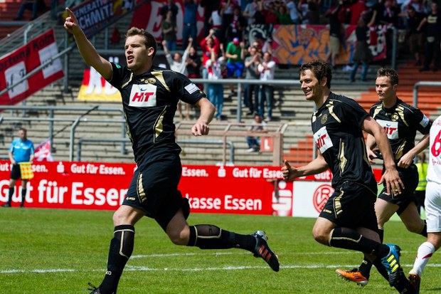 (Maurice Kühn bejubelt seinen tollen Kopfballtreffer, der die Führung im Georg-Melches-Stadion bedeutete, Foto: Gert König)