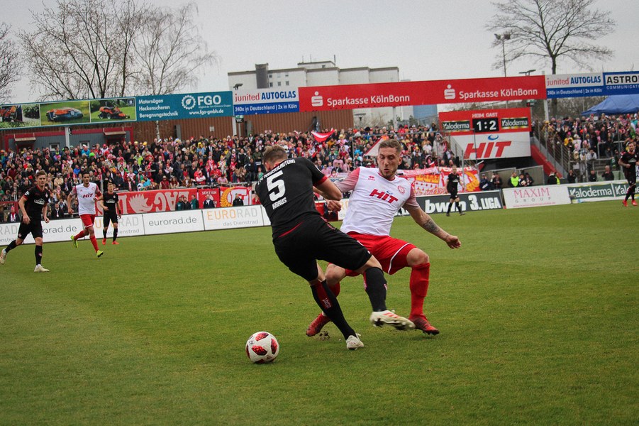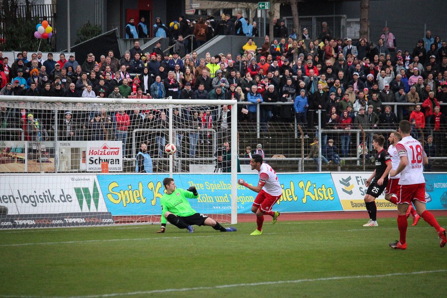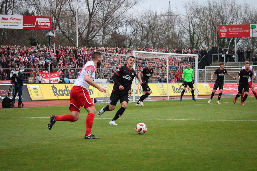 Fortuna Köln meldete sich gleich zu Beginn mit einer Doppelchance. Robin Scheu erkämpfte sich den Ball im Mittelfeld und spielte direkt in den Lauf von Hamdi Dahmani, der alleine auf Lennart Grill zulief. Der Kapitän scheiterte jedoch am ausgefahrenen Bein des Torhüters (2.). Nur eine Minute später ging Andersen über die linke Seite und spielte zurück an die Strafraumkante, an der Michael Eberwein lauerte, den Schuss aus der Distanz jedoch knapp neben den Pfosten setzte. In der 13 Spielminute machte Hamdi Dahmani es dann besser und versenkte den Ball nach Zuspiel von Michael Eberwein im langen Eck. Doch lange währte die Führung der Fortuna nicht. Christian Kühlwetter setzte zwei Minuten später die Uhren wieder auf Null und sorgte für den Ausgleich der Gäste. Es folgte ein offener Schlagabtausch im Kölner Südstadion, ehe ein Pfiff des Unparteiischen den Südstädtern einen Dämpfer verpasste. Schiedsrichter Florian Badstübner zeigte nach einem Foul an Kühlwetter auf den Punkt. Nikolai Rehnen war zwar noch am Ball, konnte aber nicht verhindern, dass der Schuss von Henrik Zuck hinter der Linie landete (27.). Das war aus Fortuna-Sicht bitter und kein Ergebnis, das den bisherigen Spielerlauf widerspiegelte. Auf der anderen Seite sorgte Andersen für den nächsten Abschluss der Fortuna. Nach einer Ecke zog er den Ball direkt auf das Tor, setzte das Spielgerät jedoch deutlich daneben. So ging es ohne weitere Tore in die Pause.