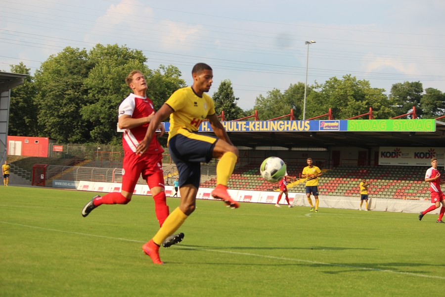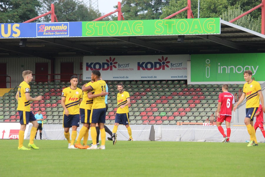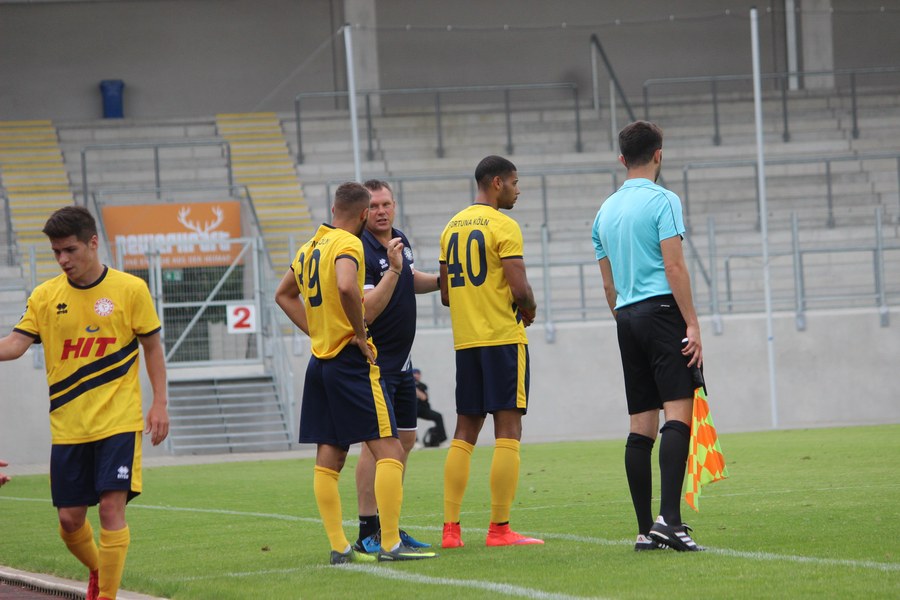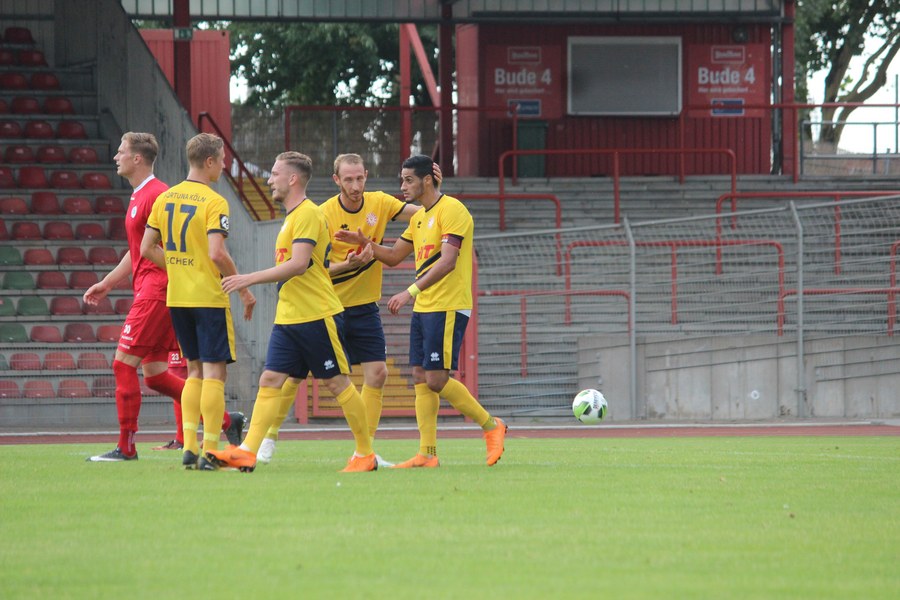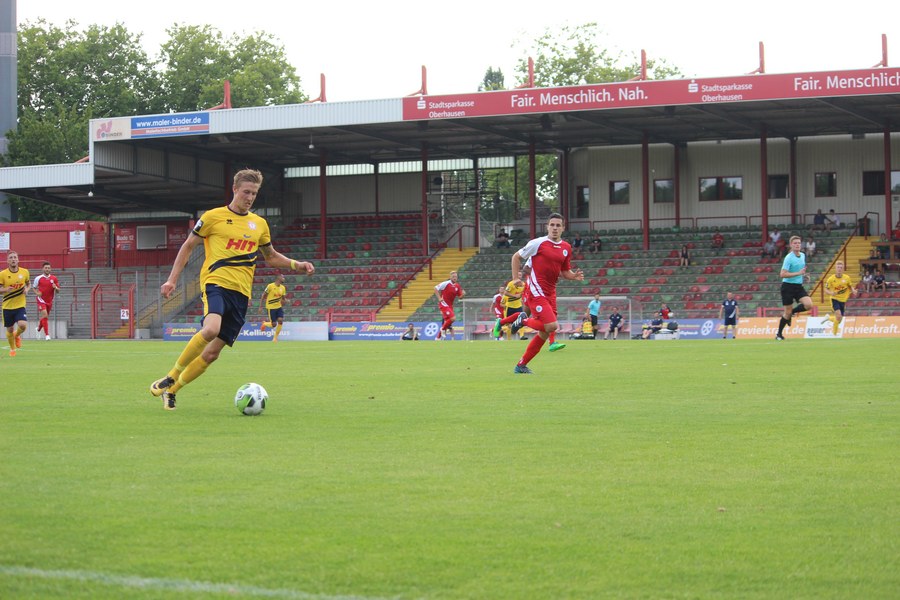 Die Mannschaften waren kaum aus der Kabine gekommen, da durfte die Fortuna schon jubeln. Kegel schickte Hartmann mit einem schnell ausgeführten Freistoß auf die Reise. Hartmann legte auf den mitgelaufenen Scheu zurück, der den Ball links unten im Tor platzierte (1.). In der Folge zeigte sich die Fortuna weiter aggressiv und lief die Gastgeber bereits sehr früh an. Zeitweise sogar so hoch, dass Hartmann den Schlussmann der Oberhausener foulte (7.). Generell war die Anfangsphase durch kleinere Fouls geprägt, da beide Mannschaften vollen Einsatz auf den Rasen brachten. Die Oberhausener wurden nach dem ersten Drittel der ersten Halbzeit mal gefährlich, als März aus der Distanz nur knapp den Kasten verfehlte (15.). Die später folgende Trinkpause tat der Fortuna offenbar gut. Nach einem rasanten Konter, den die Fortuna in erster Instanz nicht vollenden konnte, landete der Ball beim mittlerweile aufgerückten Kegel, der aus rund vierzehn Metern mit voller Kraft den Ball im Tor versenkte (26.). Die Fortuna zeigte sich weiter hellwach und legte kurz darauf nach, als Schiek mit druckvollen Pass über 40 Meter die gesamte Mannschaft von Rot-Weiß Oberhausen überraschte und Dahmani den Ball nach kurzer Mitnahme nur noch einschieben musste (30). Die Fortuna machte offensiv so gut wie alles richtig, vernachlässigte aber auch ihre Defensivaufgaben nicht. So kamen die Oberhausener erst kurz vor der Halbzeit durch Eggersglüß noch einmal zu einer Chance, als dieser aus zu spitzem Winkel an Rehnen scheiterte (41.). So ging es mit einem 3:0 aus Sicht der Fortuna in die Kabine.