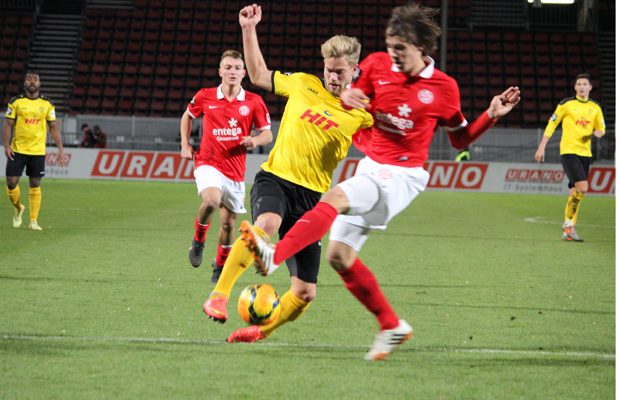 Die Fortuna sammelt gegen die U23 von Mainz 05 den nächsten Zähler für den Klassenerhalt. Dabei gingen die Kölner durch den eingewechselten Dahmani sogar in Führung (). Kurz vor dem Seitenwechsel egalisierte Weil aber die Kölner Führung (). Bereits im Hinspiel sicherte der Mainzer seiner U23 einen Punkt, als er im Südstadion per Strafstoß zum 2:2-Endstand traf. Vor 666 Zuschauern am Bruchweg entwickelte sich zunächst eine intensive Partie, in der Chancen in der Anfangsphase aber ausblieben. Erst Mitte der ersten Halbzeit häuften sich die Strafraumszenen. Nachdem sich Rahn auf rechts gegen Roßbach durchsetzte brachte Dahmani seine Flanke zur Führung im Tor unter (36.). Der 27-Jährige war erst fünf Minuten zuvor für den angeschlagenen Kessel in die Partie gekommen. Die Fortuna kontrollierte anschließend das Geschehen, musste aber trotzdem noch vor dem Seitenwechsel den Ausgleich hinnehmen: Nach einem sehenswerten Angriff über links kam Wachs zur Grundlinie durch. Dessen Rückpass wuchtete Weil zum Ausgleich ins Netz (45.).