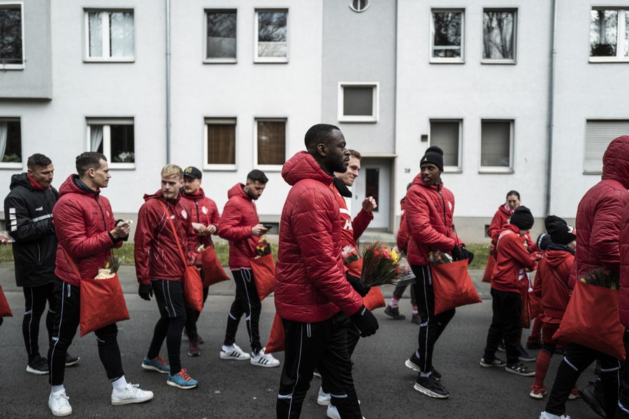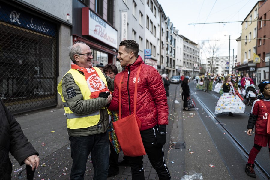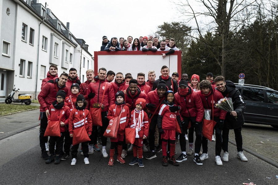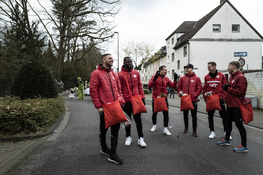 Sowohl die 1. Mannschaft mit dem Trainerstab, wie auch die Geschäftsstelle, einige Jugendspieler und Teile des Vorstandes haben sich auf die Strecke durch Zollstock gemacht und Süßigkeiten und Blumen verteilt. Dabei freuten sich die Akteure vor allem über die vielen bekannten Gesichter in rot und weiß auf der Strecke.