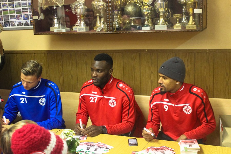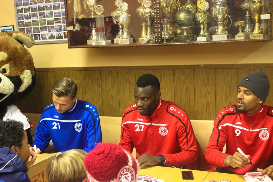 Nach dem Training ging es für beide Mannschaften rüber ins Vereinsheim. Dort hatten sie die Möglichkeit, den drei Fortunen ihre Fragen zu stellen, um so mehr über die Profifußballer zu erfahren. So durfte Keita-Ruel unter anderem über seine bisherigen Saisontore reden. Abschließend wurden noch fleißig Autogramme geschrieben und Fotos gemacht.