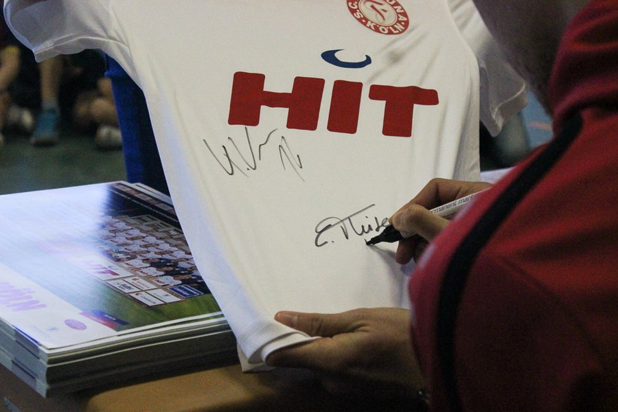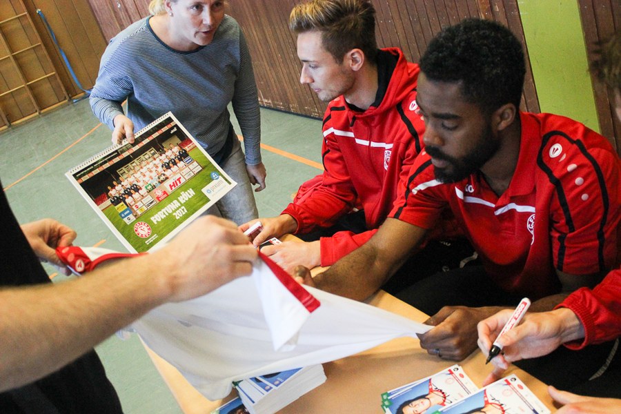 Im Anschluss an den sportlichen Teil kam die ganze Schule zusammen, um mehr über das Leben der Profi-Fußballer zu erfahren. Die Klassensprecher hatten im Vorfeld Fragen gesammelt und gaben diese als Vertreter der Klassen an die Fußballer der Fortuna weiter. Nachdem alle Fragen beantwortet waren und Christopher Theisen auch die Abseitsregel nicht unerklärt ließ, bedankten sich die Kinder bei den Südstadt-Fußballern mit einem gelungenen Überraschungsauftritt. Die drei Profis belohnten die Schüler daraufhin mit Autogrammkarten, Mannschaftspostern und Geschenktüten von Fortuna-Partner Schmitz & Nittenwilm.