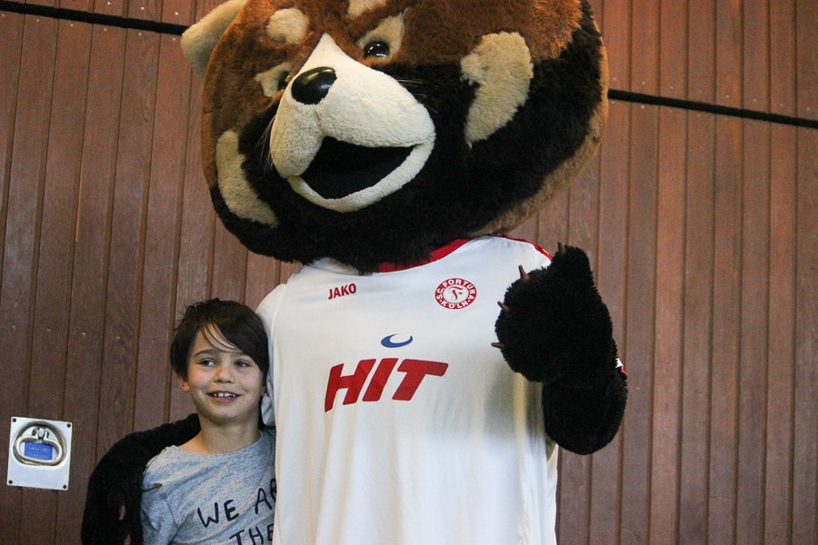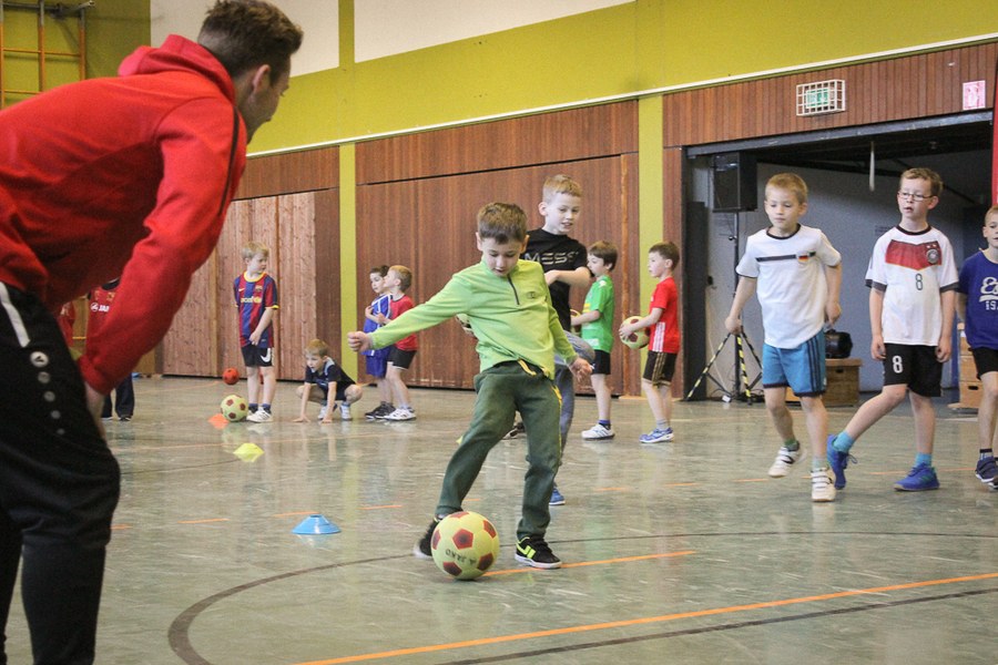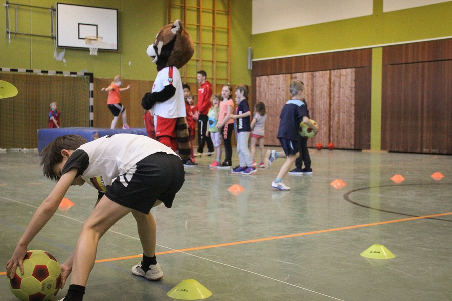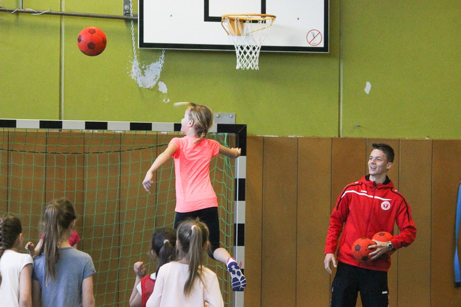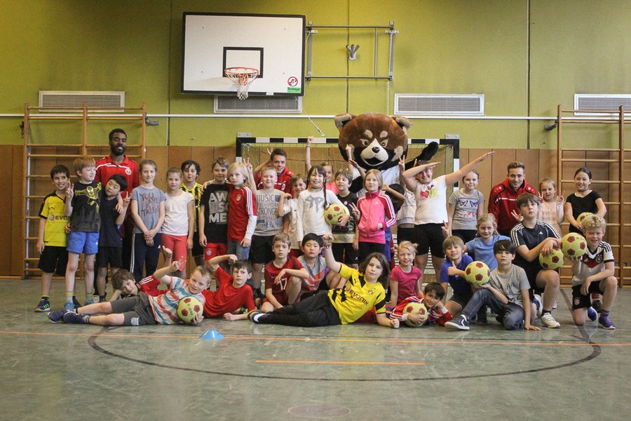 Der Montag-Morgen startete mit lachenden Gesichtern an der GGS Oberdollendorf - Christopher Theisen, Kusi Kwame, Tim Boss und Vereinsmaskottchen Fred hatten gute Laune mit nach Königswinter gebracht. Neben Übungen zum Torabschluss, Dribbling und Kopfbällen sorgten lustige Wettkämpfe für gehörig Spannung bei den Schülerinnen und Schülern der Grundschule. Wer es sich zutraute, durfte sich auch bei der Ausführung eines Fallrückziehers weiterbilden.