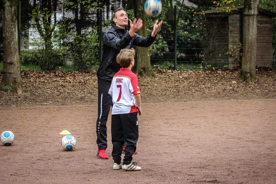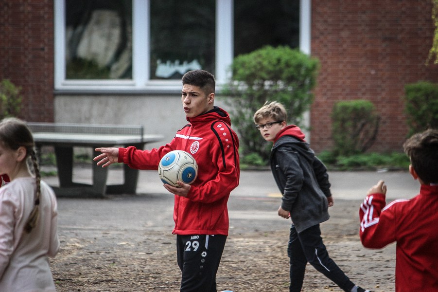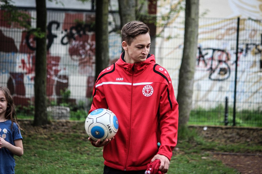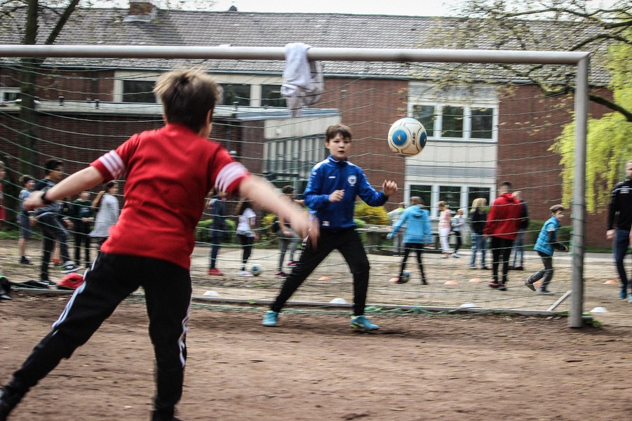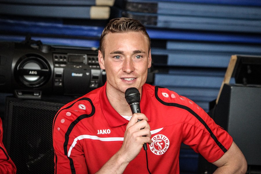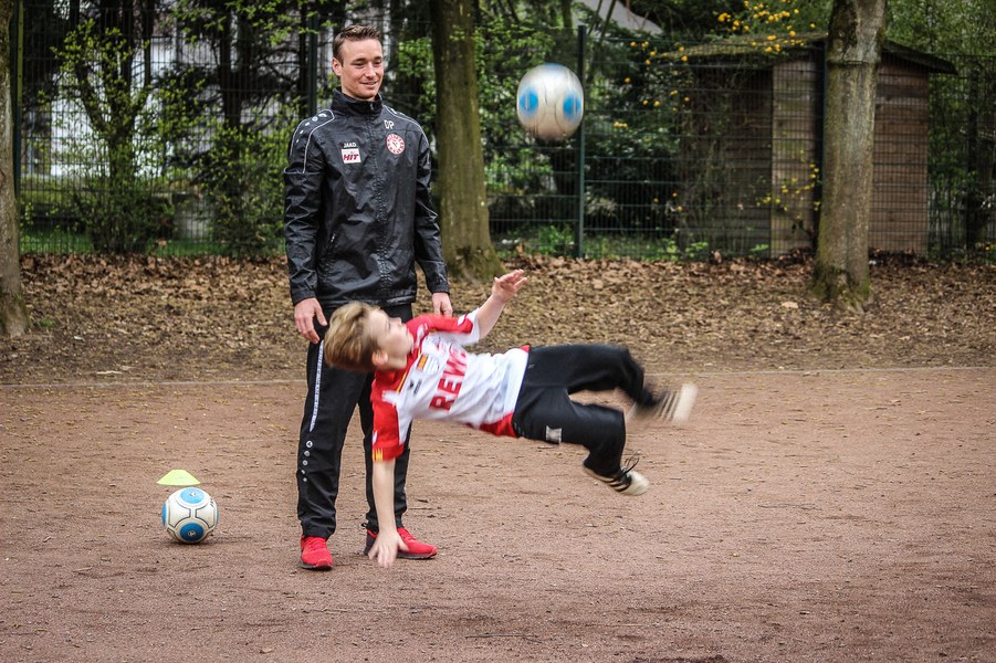 Der Einstieg in die Schulwoche war für die Kinder der Johannesschule in Höhenhaus diesmal etwas ganz Besonderes. Zusammen mit den drei Spielern Eichhorn, Ceylan und Menz von der Fortuna ging es raus auf den Schulhof, wo sie mit den Profis an der frischen Luft trainierten. Die Schüler der dritten und vierten Klassen teilten sich in drei Gruppen auf, die jeweils von einem Spieler geleitet wurden. Unter der Aufsicht von Ceylan dribbelten die Kids durch zwei Hütchenparcours, bei Menz wurde auf das Tor geschossen und Eichhorn lenkte eine Spielform, bei der die Kinder in zwei Mannschaften auf Hütchentore spielten. In regelmäßigen Abständen wurden die Gruppen gewechselt, sodass alle Kinder die unterschiedlichen Stationen einmal ausprobieren konnten. Bei sonnigem Wetter hielten es die Schüler lange draußen aus, bis es nach über zwei Stunden rund ums Fußballspielen schließlich in die Turnhalle der Grundschule ging, wo die Profis sich Autogrammen und Fragen widmeten. Vorher sangen die Schüler der Johannesschule noch gemeinsam die Hymne der Fortuna. Anschließend wollten die Kinder wissen, wann die Spieler ihr erstes Tor im Profifußball geschossen haben, welchen Verein sie außer der Fortuna besonders gern haben und wie es sich anfühlt, wenn man eine rote Karte bekommt. Das Interesse der Schüler war riesig, neben den im Voraus vorbereiteten Fragen ergaben sich im Laufe des Tages noch viele weitere, die beantwortet wurden. Als Andenken an den Tag mit den Profis der Fortuna gab es für jedes Kind Autogramme der drei anwesenden Spieler sowie ein Mannschaftsfoto der aktuellen Saison. Auch das Maskottchen Fred stand für Erinnerungsfotos zur Verfügung.