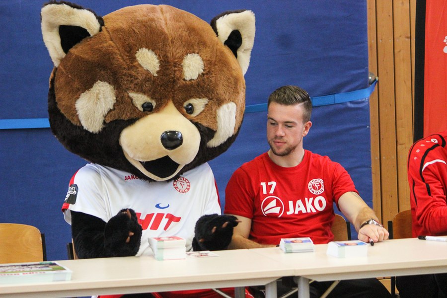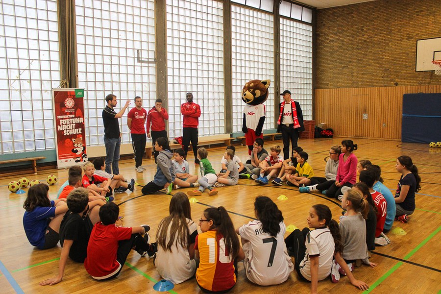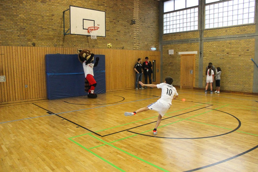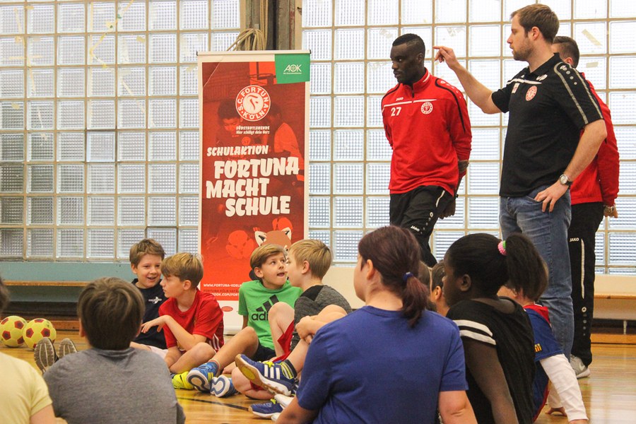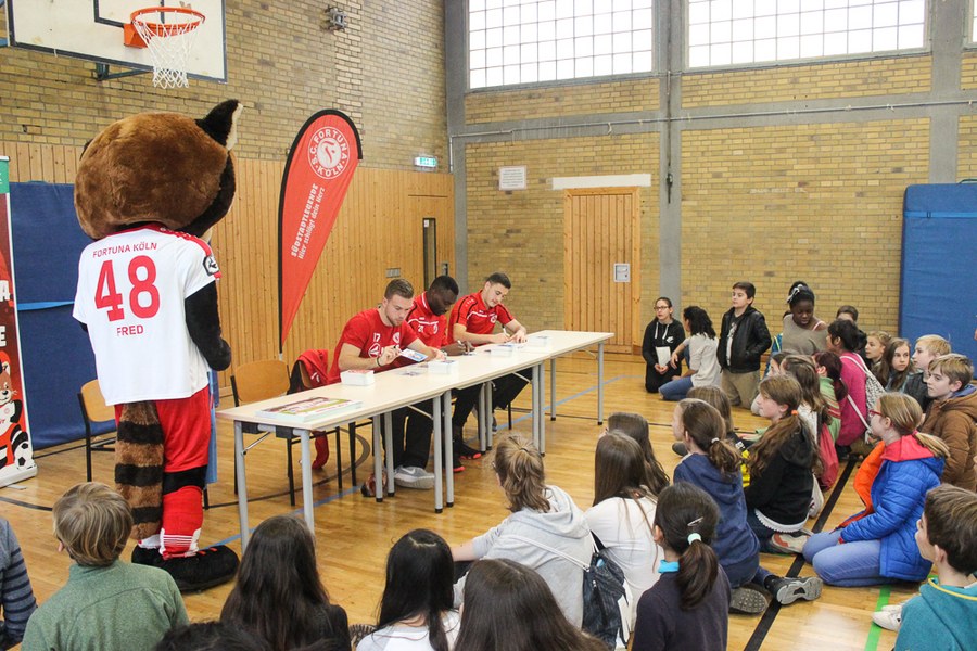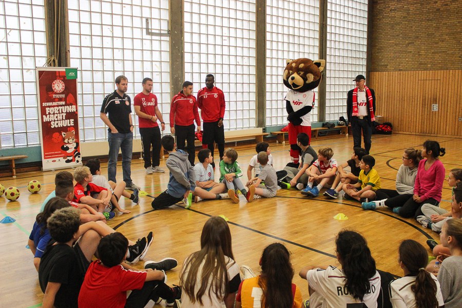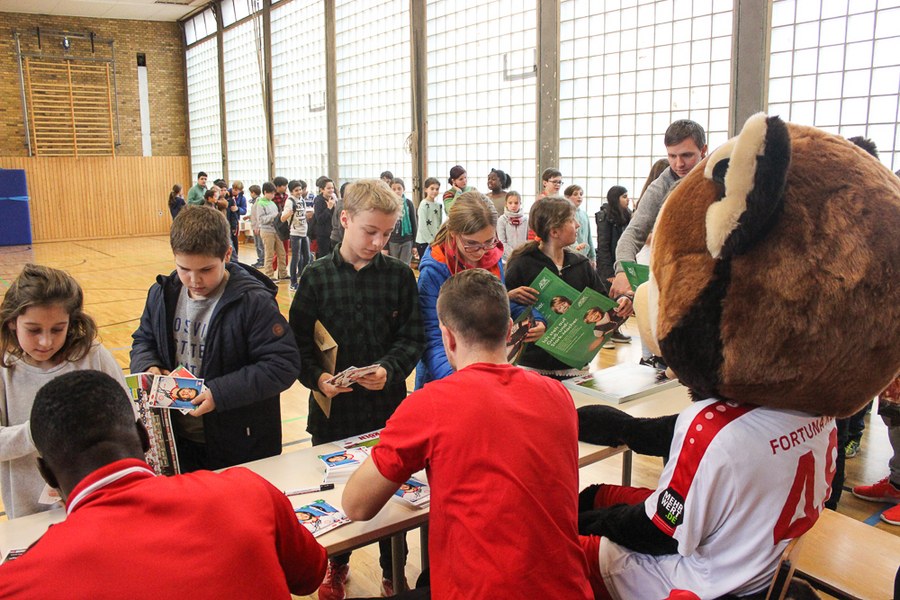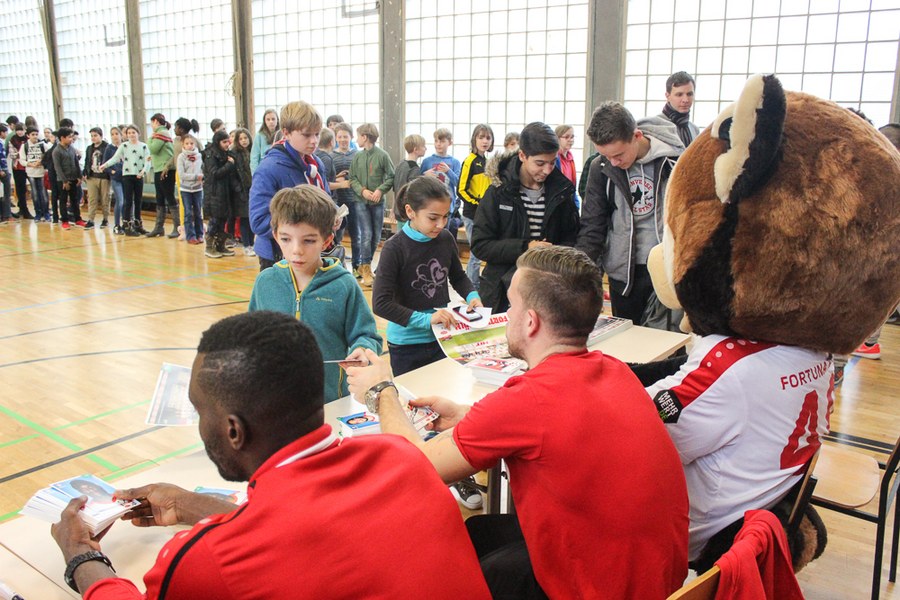In unterschiedliche Gruppen aufgeteilt, probierten sich die Schulkinder der IGIS an verschiedenen Stationen. Während bei einer Übung Dribbling im Vordergrund stand, waren es bei einer anderen Torabschlüsse. Von Flugkopfbällen bis hin zu Fallrückziehern bot das Training eine ganze Fülle an spektakulären Abschlüssen. Der mitgereiste Fred versuchte sich in der Zwischenzeit als Torwart. Jede Station stand unter der Beaufsichtigung einer der Profis. Diese achteten auf eine richtige Ausführung der Übungen und standen den Schülern mit Rat und Tat zur Seite. Neben Engelman, Mimbala und Schneider war auch Bezirksbürgermeister Andreas Hupke anwesend und schaute sich das fußballerische Können von Groß und Klein an. Nachdem man sich sportlich betätigt hatte, folgte die gewohnte Autogramm- und Frage-Runde. Für die Fußballspieler der Fortuna an sich keine neue Situation, dennoch blitzten wieder lachende Fortuna-Gesichter bei den forschen und bunten Fragen der Schulkinder auf. Zum Ende gab es noch kleine Presente, ehe sich Engelman, Mimbala und Schneider wieder auf den Weg machten und der Schultag für die Kinder wieder in Tagesordnung überging.