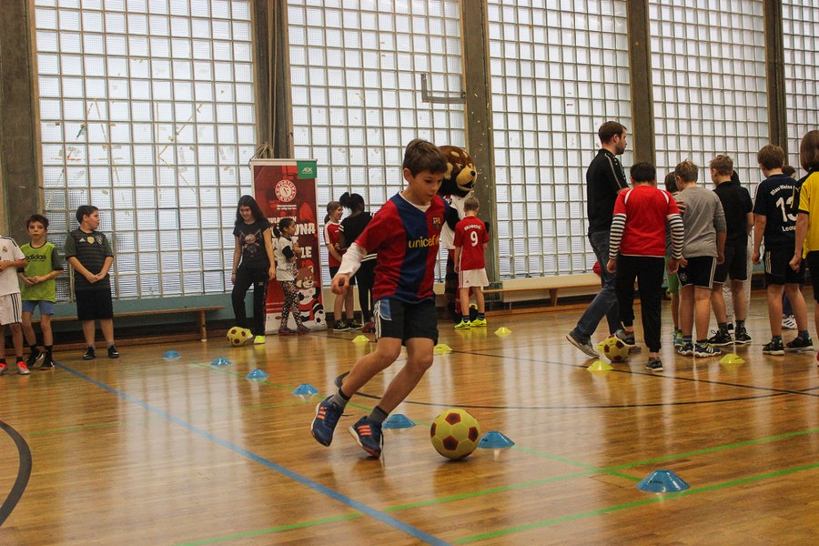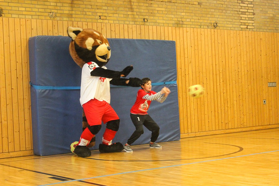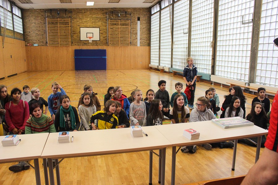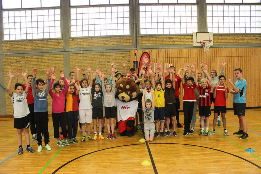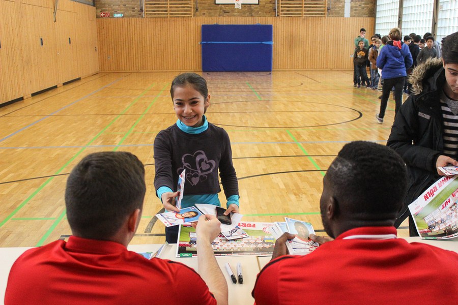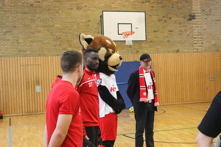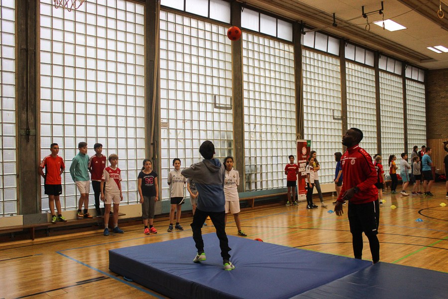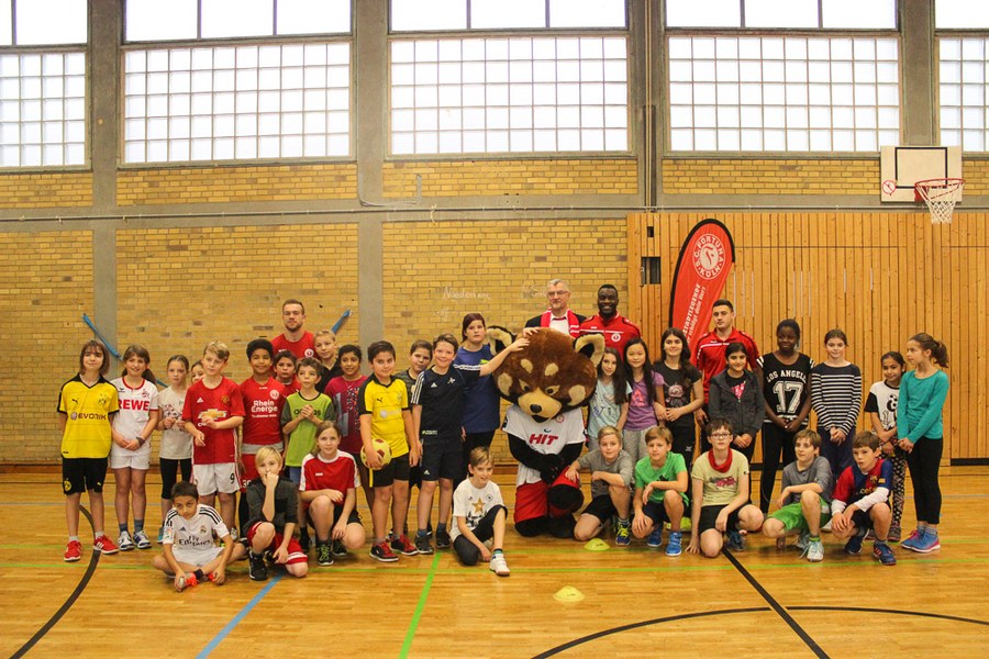 In unterschiedliche Gruppen aufgeteilt, probierten sich die Schulkinder der IGIS an verschiedenen Stationen. Während bei einer Übung Dribbling im Vordergrund stand, waren es bei einer anderen Torabschlüsse. Von Flugkopfbällen bis hin zu Fallrückziehern bot das Training eine ganze Fülle an spektakulären Abschlüssen. Der mitgereiste Fred versuchte sich in der Zwischenzeit als Torwart. Jede Station stand unter der Beaufsichtigung einer der Profis. Diese achteten auf eine richtige Ausführung der Übungen und standen den Schülern mit Rat und Tat zur Seite. Neben Engelman, Mimbala und Schneider war auch Bezirksbürgermeister Andreas Hupke anwesend und schaute sich das fußballerische Können von Groß und Klein an. Nachdem man sich sportlich betätigt hatte, folgte die gewohnte Autogramm- und Frage-Runde. Für die Fußballspieler der Fortuna an sich keine neue Situation, dennoch blitzten wieder lachende Fortuna-Gesichter bei den forschen und bunten Fragen der Schulkinder auf. Zum Ende gab es noch kleine Presente, ehe sich Engelman, Mimbala und Schneider wieder auf den Weg machten und der Schultag für die Kinder wieder in Tagesordnung überging.