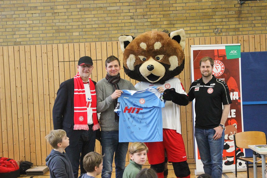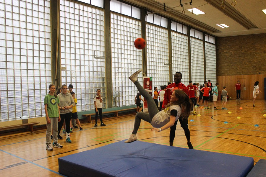 Auch am heutigen Montag fand wieder eine AOK-Schulaktion statt. Diesmal leiteten Engelman, Mimbala und Schneider eine Fußball-Trainingseinheit an der Integrierten Gesamtschule Innenstadt (IGIS). Begrüßt wurden die Fortuna-Spieler heute nicht nur von Schülern, auch Bezirksbürgermeister Andreas Hupke wohnte der Schulaktion bei.