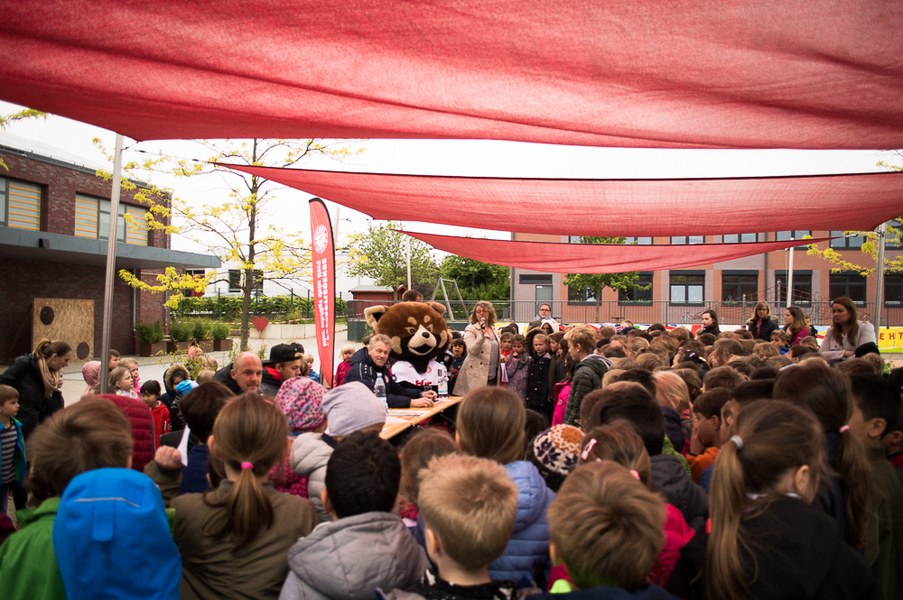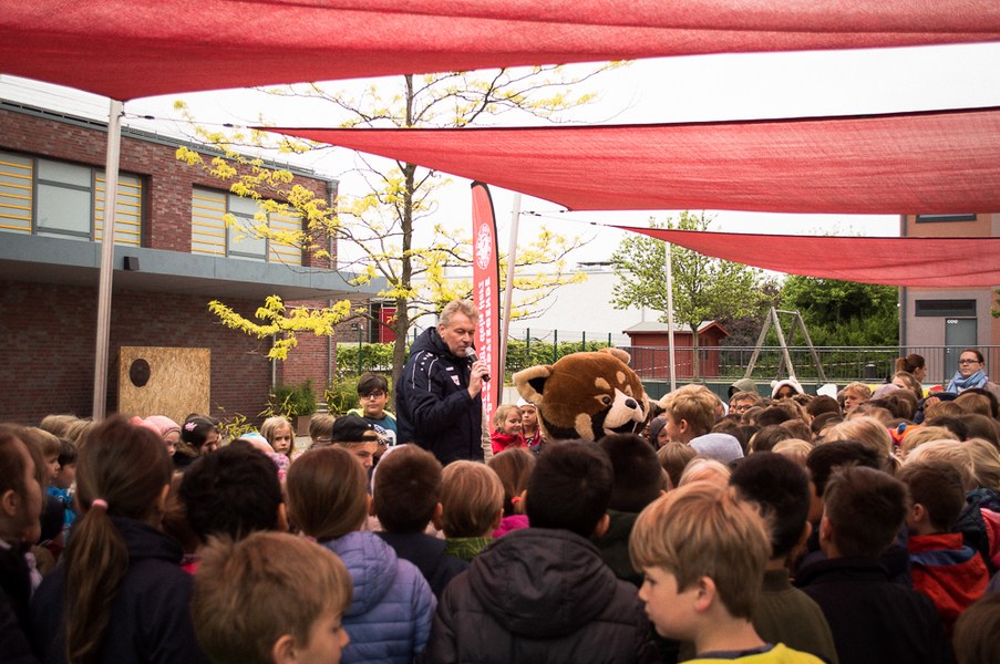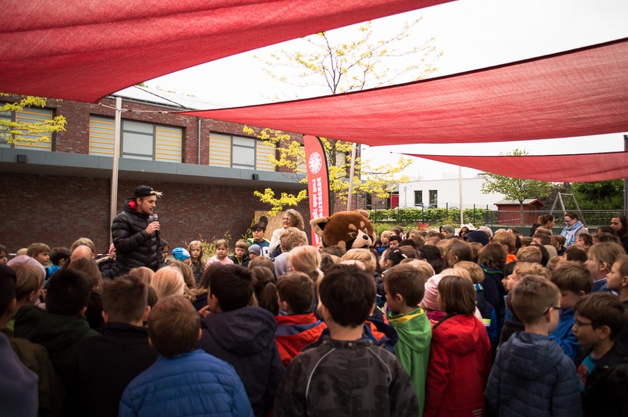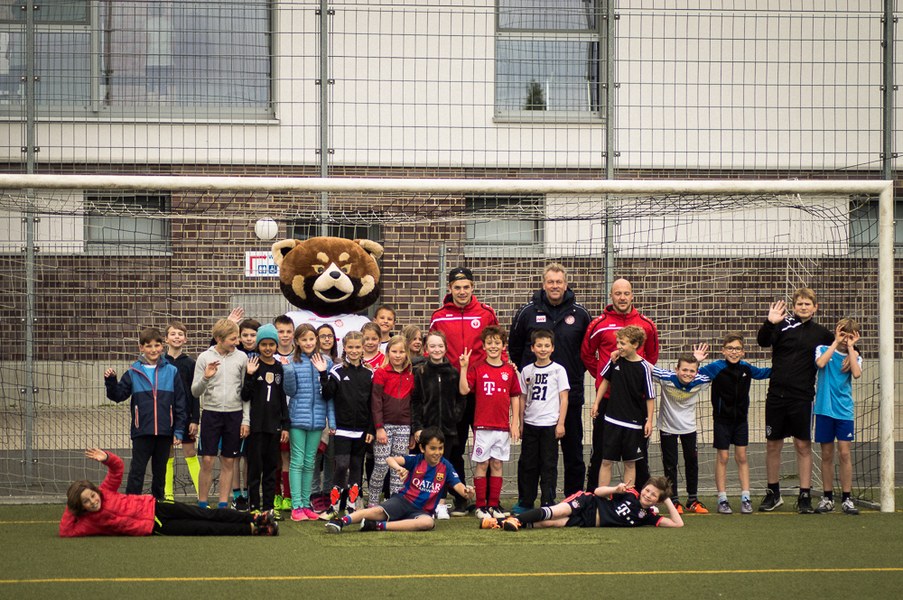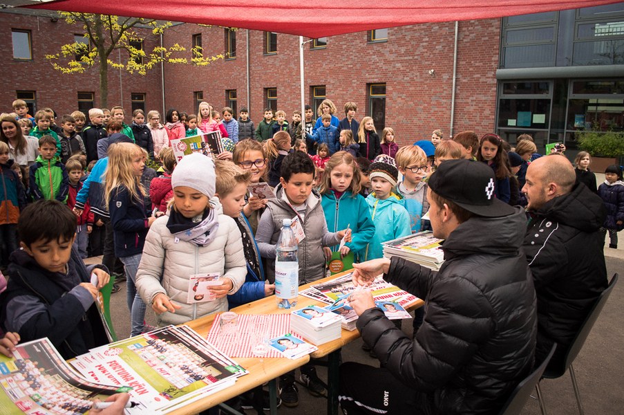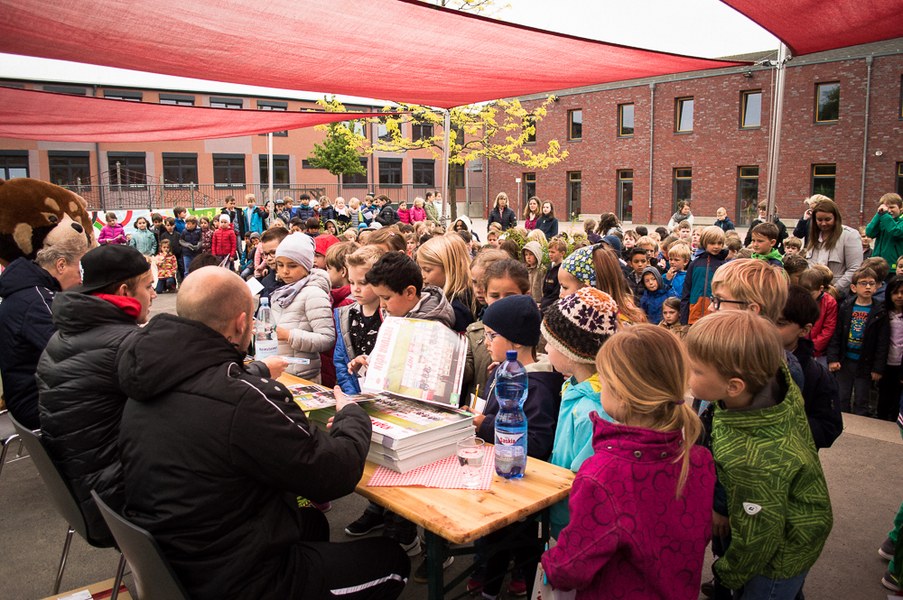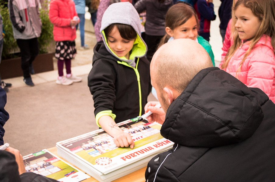 Anschließend ging es für die drei Fortunen auf den Schulhof, wo knapp 500 Schüler und Schülerinnen mit Fragen warteten. So wurden Exslager, Röcker und Hafkemeyer beispielsweise nach ihrem schönsten Erlebnis als Fußballprofi gefragt. Anschließend gab es eine gemeinsame Autogrammstunde. Die Kinder der Olympia-Schule werden die Fortuna am kommenden Samstag beim Heimspiel gegen den MSV Duisburg besuchen.