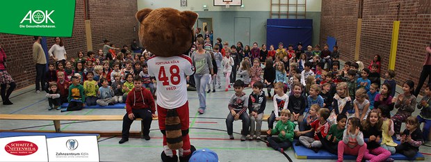 "Fortuna macht Schule" hieß es am Montag, 16.11, wieder einmal für Maskottchen Fred, Kapitän Daniel Flottmann, Lars Bender und Tim Boss. Diesmal ging es in den Sportunterricht der KGS Trierer Straße, wo die Schülerinnen und Schüler an der Seite der bewährten Profis verschiedene Stationen durchliefen.