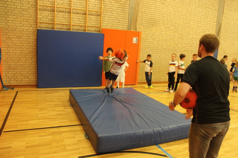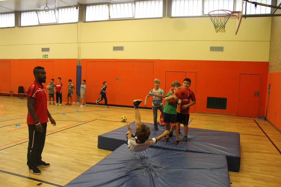 Für die Kinder war das Training in der Sporthalle eine schöne Abwechslung zum Unterricht am Montagmorgen. An drei Stationen wurden von den beiden Profis verschiedene Übungen wie Dribblings und Torschüsse erklärt und geleitet. Mit Tipps und Tricks wurden die Kinder unterstützt und hatten dabei sichtlich Spaß.