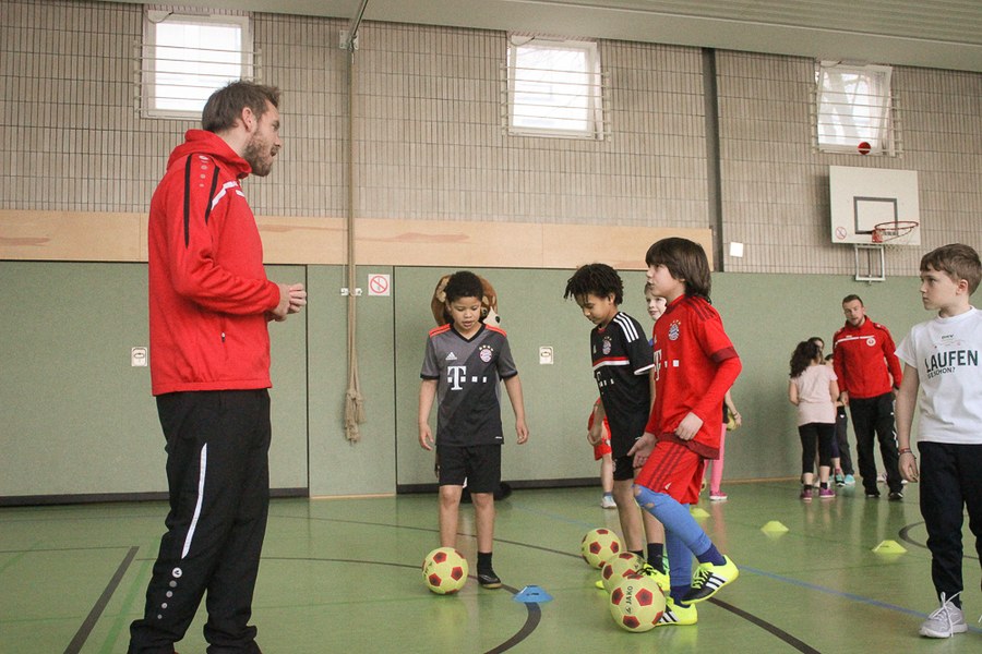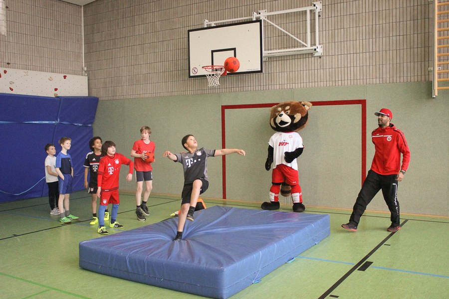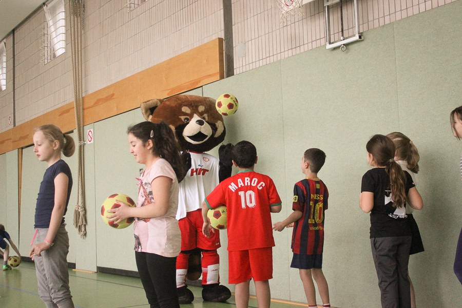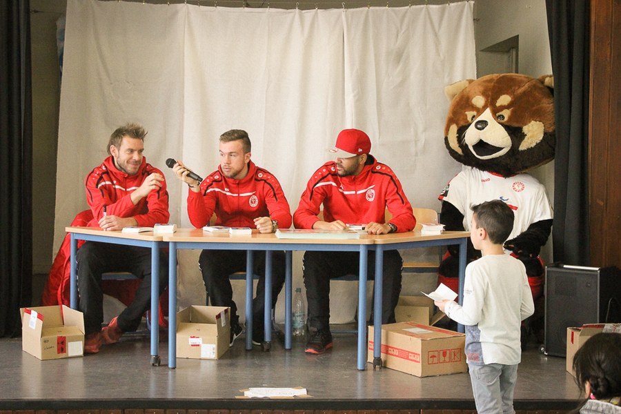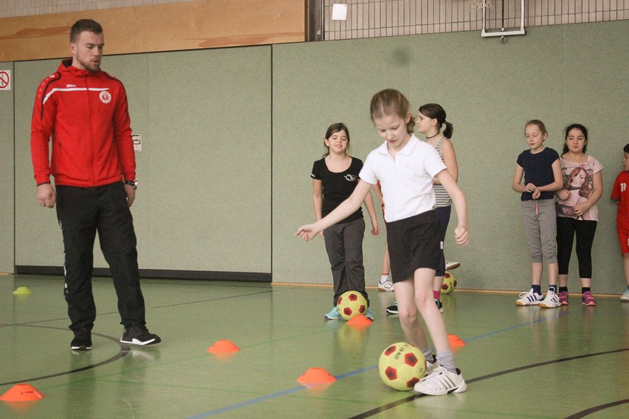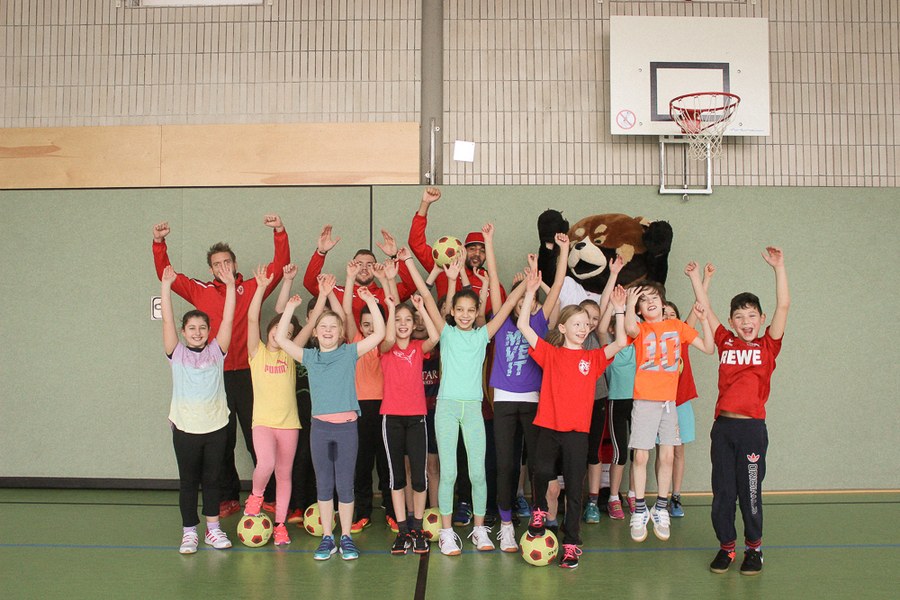 Zu Beginn des Tages wurden die Schüler in unterschiedliche Gruppen aufgeteilt. An drei Stationen wartete jeweils ein Fortuna-Profi, um das Dribbling, den Abschluss und das Kopfballspiel der Kinder zu schulen. Nachdem mit diesem Programmpunkt der sportliche Teil des Tages abgeschlossen war, ging es in die Aula der Schule. Mit einer Überraschung wartete man hier bereits gespannt auf die Fortuna-Profis. In der Aula führten die Schüler die Fortuna-Hymne mit einer kleinen Tanzeinlage auf, sehr zur Freude von Schneider, Schröder und Uaferro.