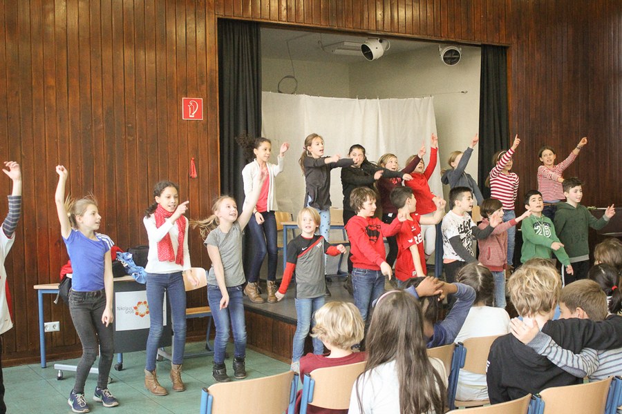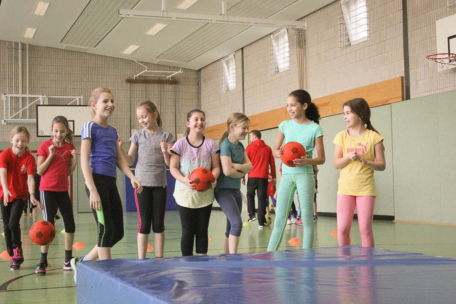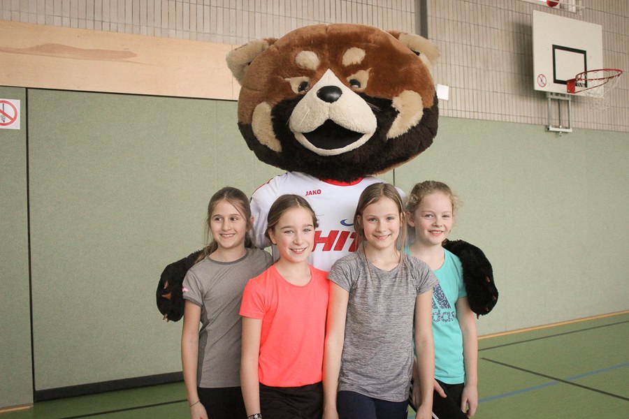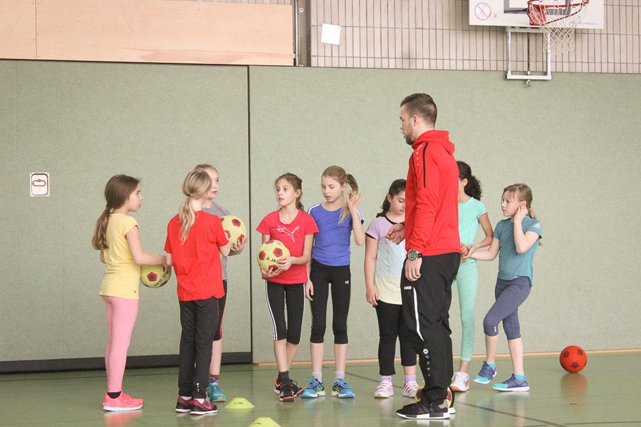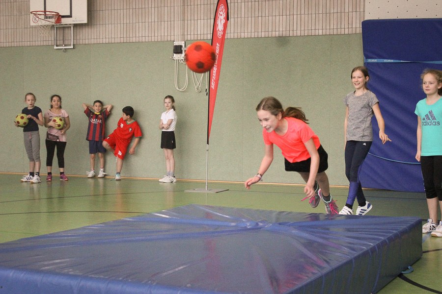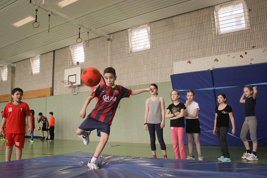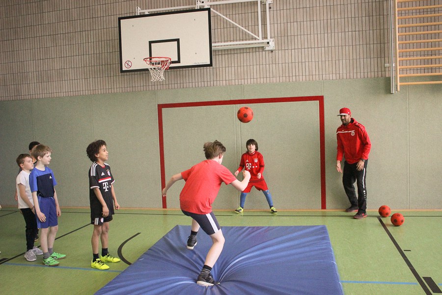 Zu Beginn des Tages wurden die Schüler in unterschiedliche Gruppen aufgeteilt. An drei Stationen wartete jeweils ein Fortuna-Profi, um das Dribbling, den Abschluss und das Kopfballspiel der Kinder zu schulen. Nachdem mit diesem Programmpunkt der sportliche Teil des Tages abgeschlossen war, ging es in die Aula der Schule. Mit einer Überraschung wartete man hier bereits gespannt auf die Fortuna-Profis. In der Aula führten die Schüler die Fortuna-Hymne mit einer kleinen Tanzeinlage auf, sehr zur Freude von Schneider, Schröder und Uaferro.