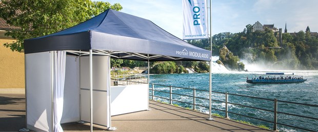 Herzstück der Pro-Tent Zeltsysteme ist das Pro-Tent MODUL 4000. Kein anderes Faltzeltsystem bietet so viele Gestaltungsmöglichkeiten und einzigartige Features wie dieses patentierte System. Weltweit einzigartig: Mit zusätzlichen Standbeinen und Querverbindern entstehen auf Basis eines modularen 1,5-Meter-Rasters mit wenigen Handgriffen individuelle Kabinenlösungen und Innenraum-Konfigurationen. Und mit individuellen Druckmotiven aus der Pro-Tent eigenen Druckerei wird aus jedem Zelt ein aufmerksamkeitsstarker Werbeträger.