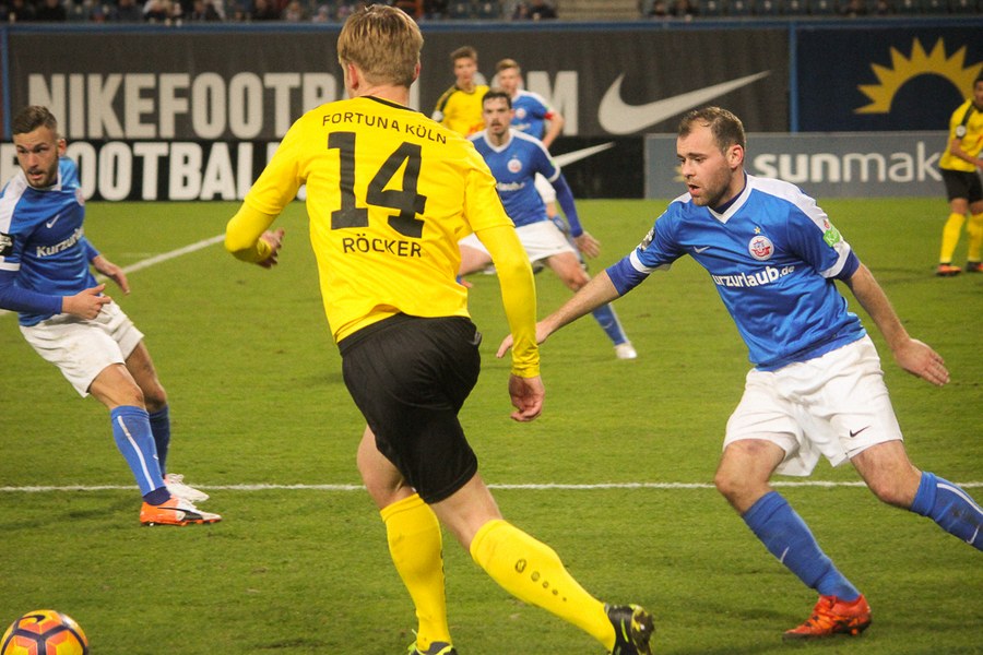 Mit der ersten Aktion nach dem Anpfiff provoziert die Fortuna beinahe ein Eigentor (1.). Es war ein guter Auftakt der Fortuna, auch wenn Hansa in der Folge das Spiel in Richtung Kölner Hälfte verlegte. Mit einem Volley von Bender hatten die Südstädter aber zunächst die gefährlicheren Abschlusssituationen (10.). Hansa hatte aber mehr vom Ball und erspielte sich eine Vielzahl an Standardsituationen. Nach der vierten Rostocker Ecke kam Henn mal zum Abschluss (17.). Richtig gefährlich wurde es auf beiden Seiten allerdings nicht. Der Fokus lag darauf, Fehler zu vermeiden. So dominierten kompakte Defensiven das Geschehen. Nach einem Ballgewinn von Kessel hatte die Fortuna mal etwas Platz zum Gegenstoß, aber Kessels Schuss von der Strafraumkante wurde geblockt (32.). Das Publikum wurde im Anschluss unruhiger, weil Rostock wenig Ideen versprühte. Einzig Bischoff versuchte das Spiel an sich zu reißen, mit bis dato mässigem Erfolg. Die Fortuna hatte so die griffigeren Aktionen. Ein Schussansatz und ein Kopfball von Theisen strahlten aber ebenso nicht die ganz große Torgefahr aus (37./45.), sodass es torlos in die Kabine ging.