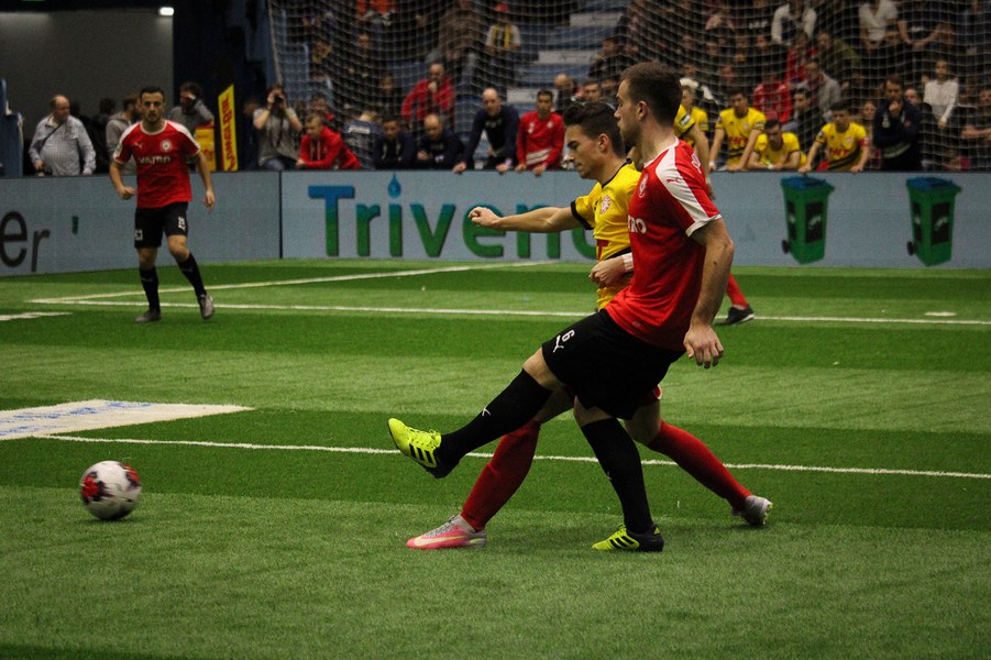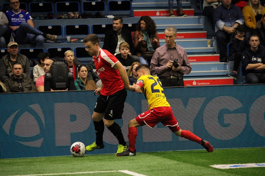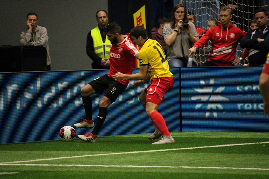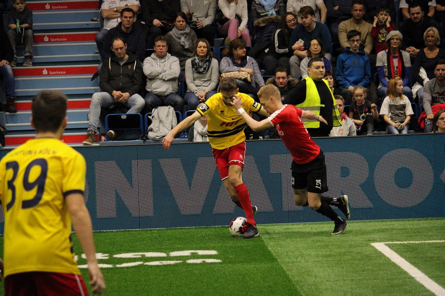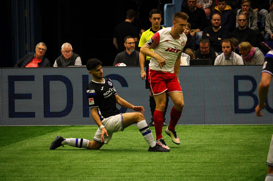 In der ersten Partie der Gruppe B traf Fortuna Köln in der SCHWALBE arena auf Bielefeld. Gegen den Zweitligisten gerieten die Kölner schnell durch ein Tor von Can Özkan in Rückstand. Semir Ucar erhöhte vor dem Seitenwechsel auf 2:0, Özkan noch vor der Pause auf 3:0. Im zweiten Durchgang verwandelte Ucar einen Neunmeter zum 4:0. Nur kurz danach gelang Thomas Idel der 1:4-Anschlusstreffer für die Südstädter. Es folgte das 2:4 durch Alem Koljic. Nico Ochojski hatte anschließend nach feinem Zuspiel von Ali Ceylan sogar die Chance zum 3:4, doch er scheiterte am Bielefelder Torhüter Baboucarr Gaye. So kam es, wie es kommen musste: Arminia konterte den Drittligisten aus und traf durch Cerruti Siya zum 5:2 und in der letzten Spielminute durch Joey Müller zum 6:2.