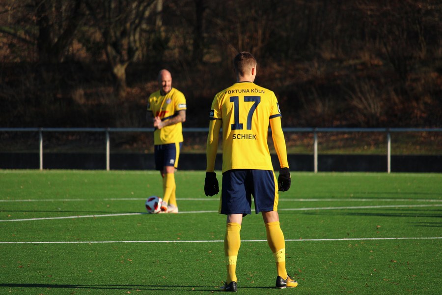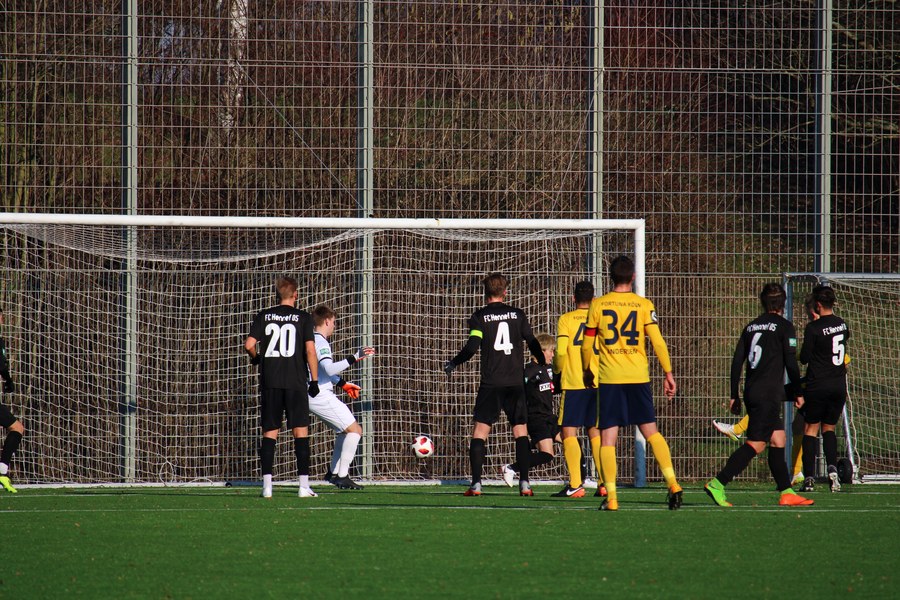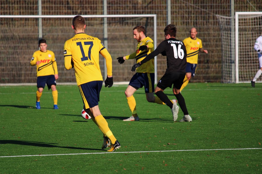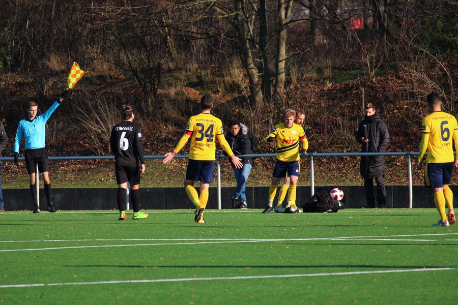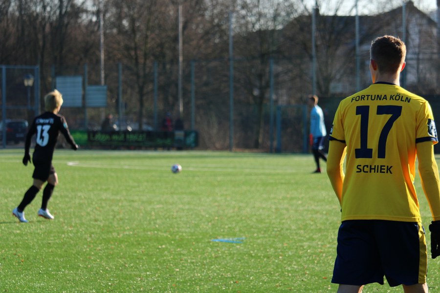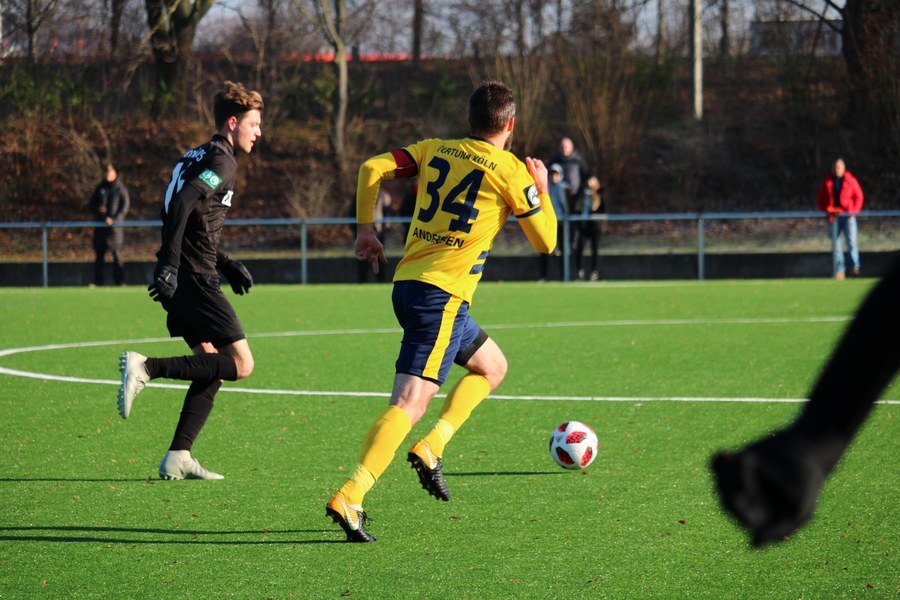 Die Fortuna begann mit Jannik Bruhns, Dominik Ernst, Back-up-Spieler Alwin Komolong, Nico Ochojski, Alem Koljic, Sebastian Schiek, Ali Ceylan, Okan Kurt, Kristoffer Andersen, Moritz Hartmann und Maurice Exslager. Gegen den Mittelrheinligisten übten die Südstädter von der ersten Minute an Druck aus. In der 8. Minute hatte Exslager nach Vorlage von Ernst die erste richtig gute Chance für das Kölner Team, doch Keeper Niklas Kirhoff wehrte den Schuss aus kürzester Entfernung ab.