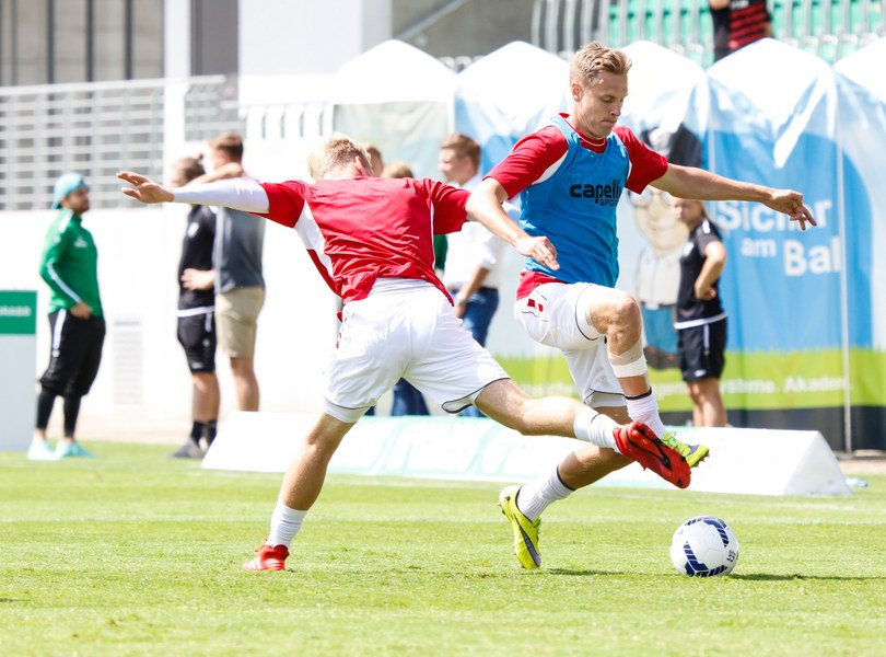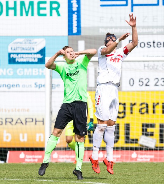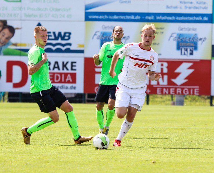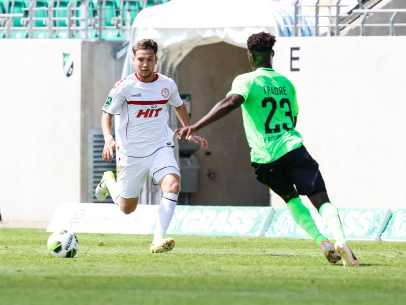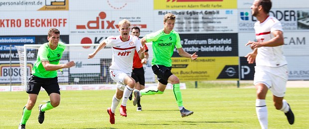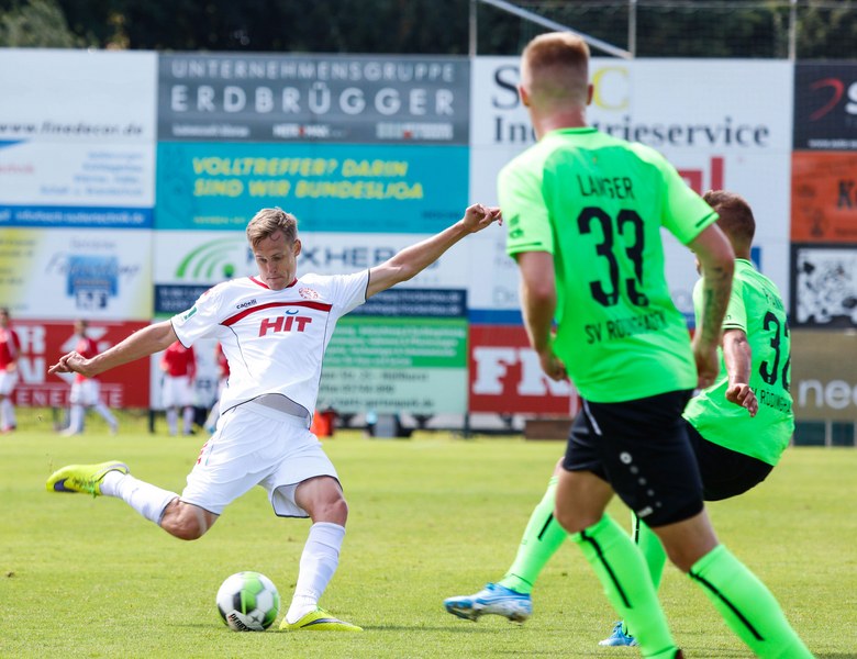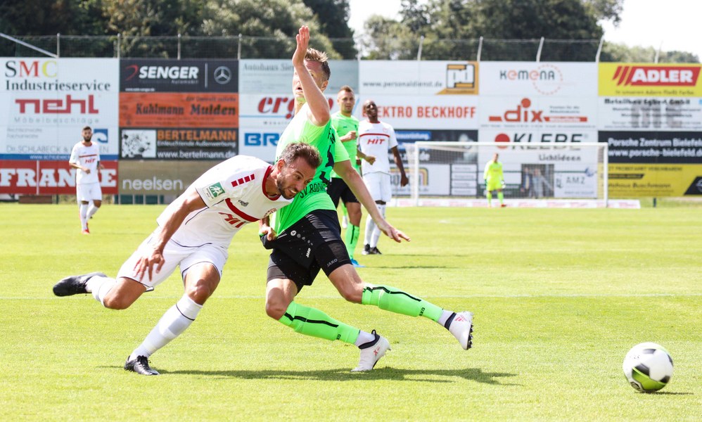 Abtasten war in der Anfangsphase angesagt, ehe Rödinghausen in der 9. Minute für den ersten Nadelstich sorgte. Mit einem Pass über die letzte Reihe hebelte Rödinghausen die ganze Abwehr aus, sodass Tobias Steffen alleine auf Kevin Rauhut zulief. Der Kölner Schlussmann fuhr im 1 gegen 1 jedoch blitzschnell das linke Bein aus und klärte den Ball. Den Nachschuss setzte der SVR neben das Tor. Fortuna zeigte sich beeindruckt und hatte Mühe, den Gastgeber aus der eigenen Hälfte zu bekommen. Letztlich sorgte eine Ecke für das erste Tor des Tages. Rödinghausens Julian Wolff war am zweiten Pfosten zur Stelle und traf zur Führung der Gastgeber (14.). Nur vier Minuten später war es Christian Derflinger, der per Direktabnahme von der Sechzehner-Kante auf 2:0 erhöhte. Kevin Rauhut hatte die Finger zwar noch dran, konnte den strammen Schuss aber nicht mehr über die Latte lenken. Für die erste Chance der Fortuna sorgte Kelvin Lunga. Nach Hereingabe von Alem Koljic von der linken Seite hielt Lunga am zweiten Pfosten den Fuß hin, setzte den Ball aber neben das Tor (25.). Auf der Gegenseite sorgte ein erneuter Standard für Gefahr vor dem Kasten von Kevin Rauhut. Eine Freitsoß aus gut 18 Metern landete im Getümmel vor dem Strafraum, der Abschluss landete schließlich am Außenpfosten.