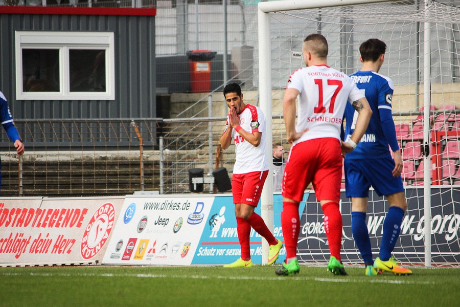 Die Fortuna zeigte sich von Anpfiff weg dominant und übernahm die Kontrolle über das Spiel: Nach der ersten Ecke tauchte so Dahmani frei vor Klewin auf, scheitere aber an Erfurts Schlussmann (4.). Ansonsten sprang aus einem optischen Übergewicht nicht viel Zählbares für die Fortuna raus. Erfurt zeigte sich aber sehr zurückhaltend. Umso überraschender war die Führung für die Gäste: Nachdem sich auf Links Odak gegen Bender durchsetzte, schob Kammlott am kurzen Pfosten zum 1:0 für Erfurt ein (16.). Der Gegentreffer lähmte das Südstadion zunächst. Erst nach und nach versuchte die Fortuna wieder Druck aufzubauen. Es fehlte allerdings die Durchschlagskraft im letzten Drittel. So spielte sich nur wenig im Erfurter Strafraum ab, die das Ganze kompakt verteidigten. Ab und zu lauerten die Gäste mal auf Konter und beschäftigten die Fortuna so. So kamen die Südstädter kaum in Tritt, weil viel im Ansatz hängen blieb. Vielmehr hatte Erfurt die Chance auf das nächste Tor, als Nikolaou Aydin im Strafraum schickte, aber Boss zur Stelle war (44.). So ging es nur mit 0:1 aus Fortuna-Sicht in die Kabine.