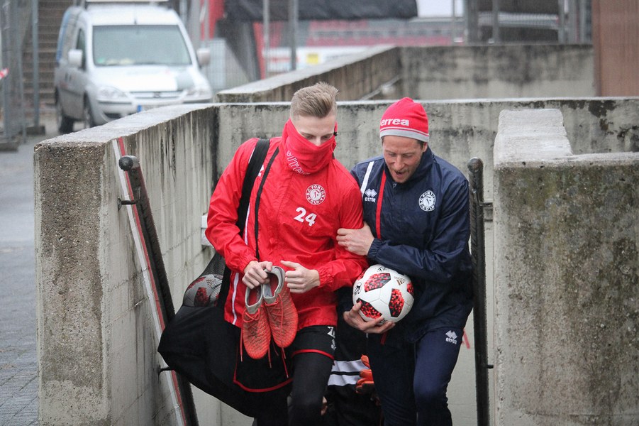 Für einen Wermutstropfen sorgte dann eine Situation beim abschließenden Trainingsspielchen des Drittligisten. Denn Abwehrspieler Steven Ruprecht zog sich bei einem unglücklichen Zusammenprall mit Aaron Eichhorn eine Verletzung am linken Sprunggelenk zu, sodass ihn Co-Trainer André Filipovic und Physiotherapeut Christian Osebold anschließend beim Verlassen des Platzes abstützen mussten. Wie schwer die Läsion ist, lässt sich zum aktuellen Zeitpunkt noch nicht sagen. Klarheit soll ein MRT-Befund bringen, der noch aussteht.