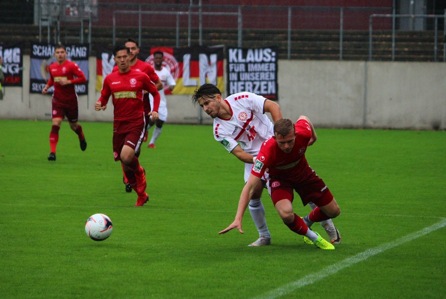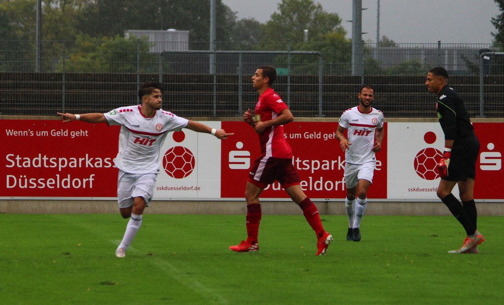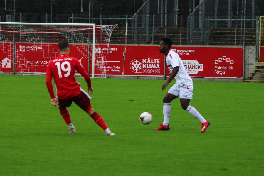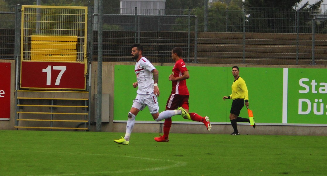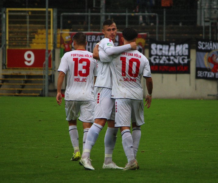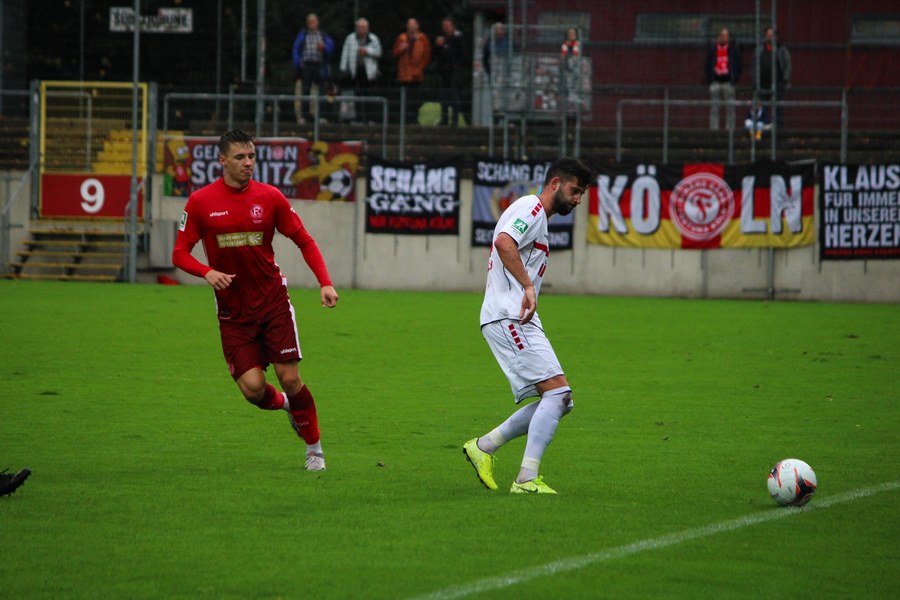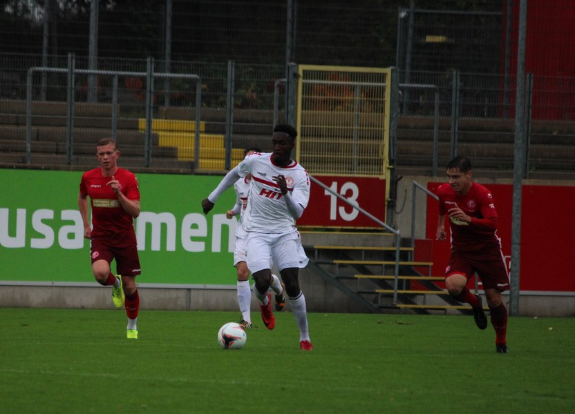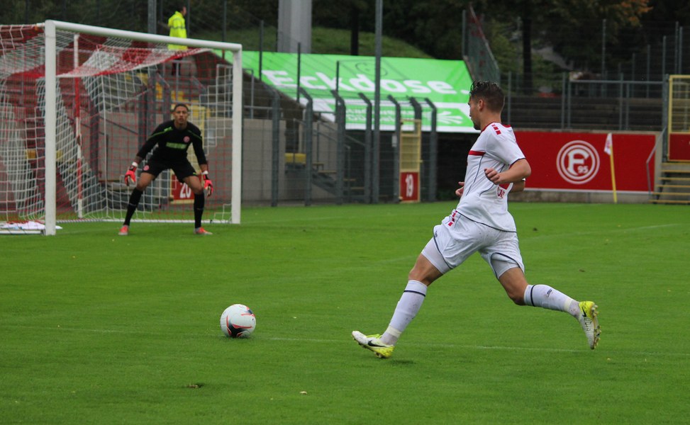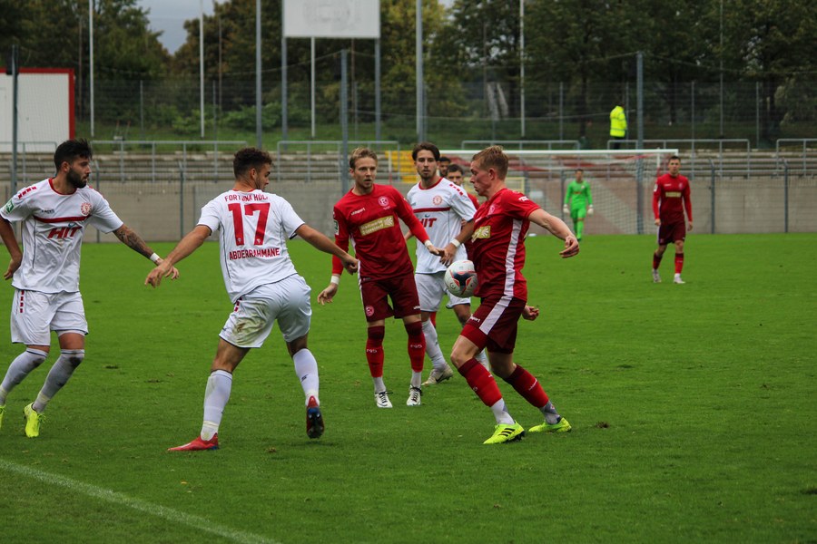 Zum Abschluss der englischen Woche ging es für Fortuna Köln zur U 23 von Fortuna Düsseldorf. In der verregneten Landeshauptstadt setzte Trainer Thomas Stratos auf die selbe Startelf, die am Mittwoch den Weg zum zweiten Saisonsieg ebnete. Doch kaum waren elf Minuten gespielt, da sah sich diese Elf bereits im Rückstand. Kevin Hagemann tankte sich über die rechte Angriffsseite in den Strafraum und hatte den Blick für den besser platzierten Appelkamp, der den zurückgelegten Ball zur frühen Führung der Gastgeber einschob (11.). Nur zwei Minuten später versuchte es der Torschütze aus der Distanz, zog seinen Schuss aber knapp über die Latte. Die Südstädter zeigten sich etwas beeindruckt von der Führung der Gastgeber und wartete weiter auf die schnellen Umschaltmomente. So wurde Koljic über die rechte Seite geschickt und brachte seine Flanke auf den ersten Pfosten, wo Düsseldorf vor Roman Prokoph klärte. Der getretene Eckball von Salman landete anschließend auf dem Kasten der Gastgeber (16.). Auch Ochojski hatte mit seinem Schuss aus der Distanz keinen Erfolg. Okoye hatte im ersten Versuch zwar Probleme, den Ball vor dem herbeieilenden Prokoph dann aber sicher. Die Kölner schüttelten sich und kamen immer besser in die Partie. Vor allem Aktivposten Mike Owusu leitete immer wieder gefährliche Situationen ein. Erst landete der Ball nach Owusu-Flanke bei Dennis Brock, der mit seinem Volleyabschluss an einem Düsseldorfer Rücken scheiterte (28.), dann bewies er einen feinen Fuß und bereitete den Ausgleich durch Salman vor. Owusu steckte auf Fortunas Nummer 10 durch, der den Ball trocken zum Ausgleich einschob (34.). Kurz vor der Pause gab es dann noch einen kurzen Schreckmoment für die Fortuna aus Köln. Appelkamp stand völlig blank an der Kante des Sechzehners und zog den Ball auf das Tor. Der Pfosten rettete für Rauhut, der dem Ball nur noch hinterherschauen konnte. Damit ging es mit dem Unentschieden in die Pause. Fortuna war wieder im Spiel.