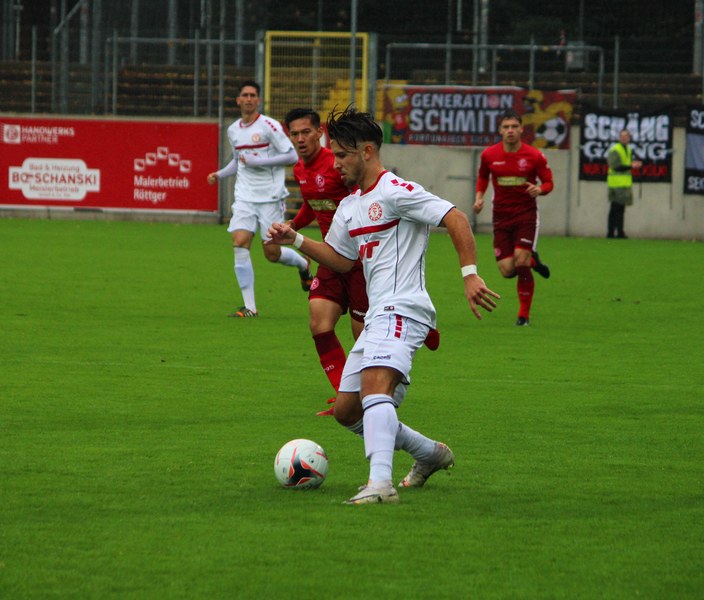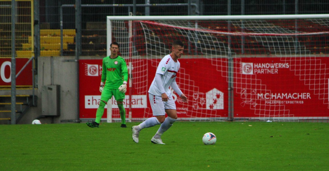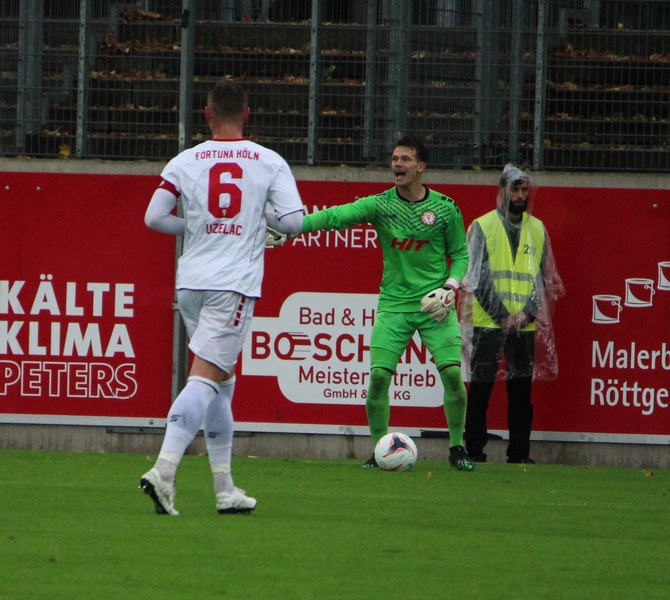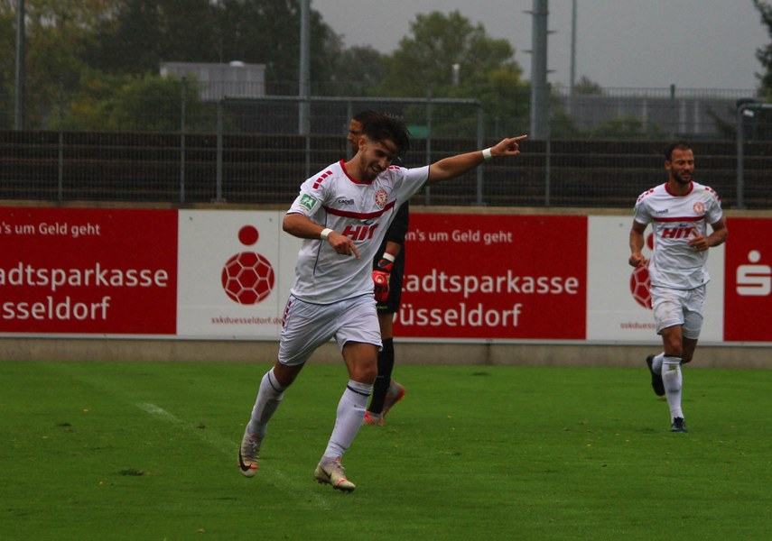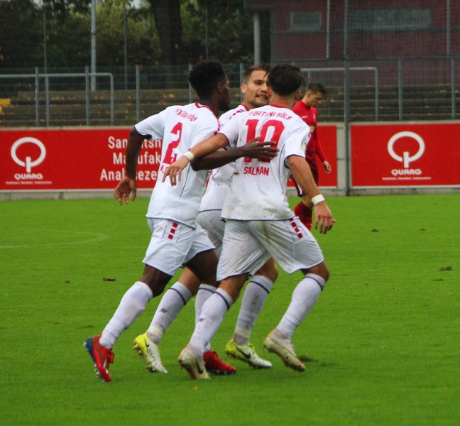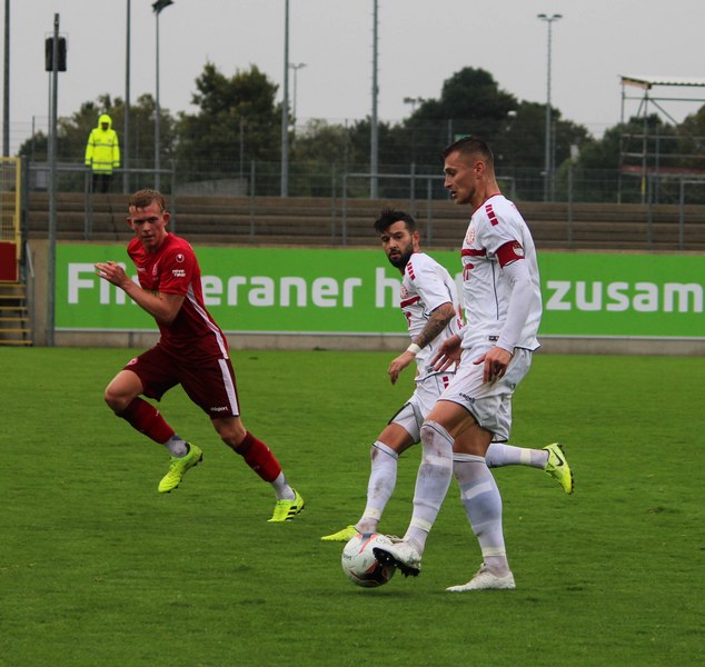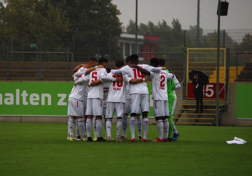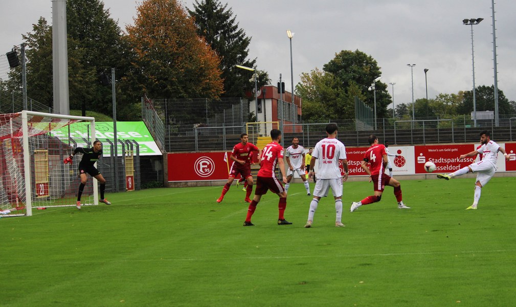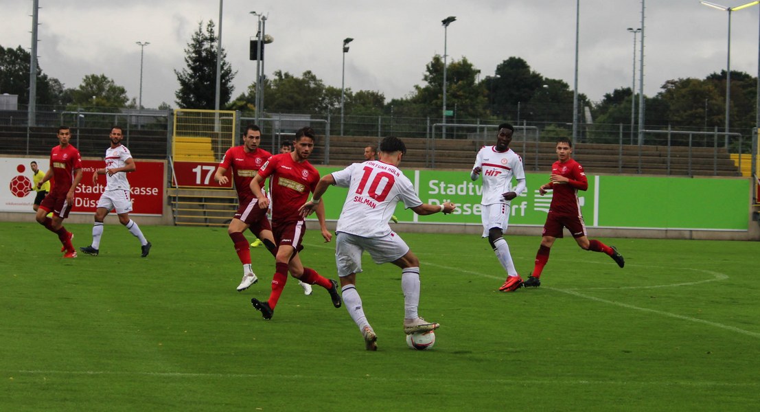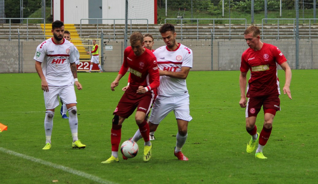 Zum Abschluss der englischen Woche ging es für Fortuna Köln zur U 23 von Fortuna Düsseldorf. In der verregneten Landeshauptstadt setzte Trainer Thomas Stratos auf die selbe Startelf, die am Mittwoch den Weg zum zweiten Saisonsieg ebnete. Doch kaum waren elf Minuten gespielt, da sah sich diese Elf bereits im Rückstand. Kevin Hagemann tankte sich über die rechte Angriffsseite in den Strafraum und hatte den Blick für den besser platzierten Appelkamp, der den zurückgelegten Ball zur frühen Führung der Gastgeber einschob (11.). Nur zwei Minuten später versuchte es der Torschütze aus der Distanz, zog seinen Schuss aber knapp über die Latte. Die Südstädter zeigten sich etwas beeindruckt von der Führung der Gastgeber und wartete weiter auf die schnellen Umschaltmomente. So wurde Koljic über die rechte Seite geschickt und brachte seine Flanke auf den ersten Pfosten, wo Düsseldorf vor Roman Prokoph klärte. Der getretene Eckball von Salman landete anschließend auf dem Kasten der Gastgeber (16.). Auch Ochojski hatte mit seinem Schuss aus der Distanz keinen Erfolg. Okoye hatte im ersten Versuch zwar Probleme, den Ball vor dem herbeieilenden Prokoph dann aber sicher. Die Kölner schüttelten sich und kamen immer besser in die Partie. Vor allem Aktivposten Mike Owusu leitete immer wieder gefährliche Situationen ein. Erst landete der Ball nach Owusu-Flanke bei Dennis Brock, der mit seinem Volleyabschluss an einem Düsseldorfer Rücken scheiterte (28.), dann bewies er einen feinen Fuß und bereitete den Ausgleich durch Salman vor. Owusu steckte auf Fortunas Nummer 10 durch, der den Ball trocken zum Ausgleich einschob (34.). Kurz vor der Pause gab es dann noch einen kurzen Schreckmoment für die Fortuna aus Köln. Appelkamp stand völlig blank an der Kante des Sechzehners und zog den Ball auf das Tor. Der Pfosten rettete für Rauhut, der dem Ball nur noch hinterherschauen konnte. Damit ging es mit dem Unentschieden in die Pause. Fortuna war wieder im Spiel.