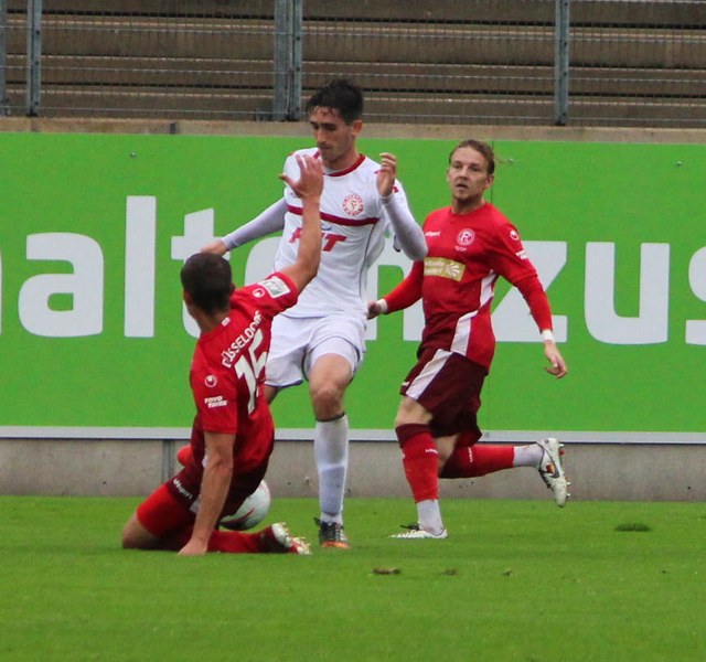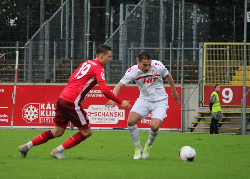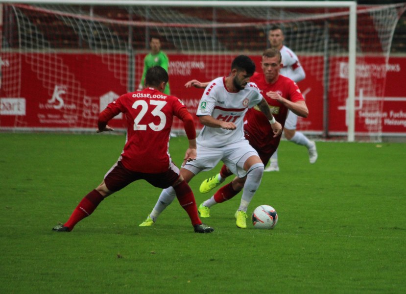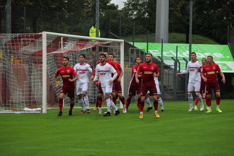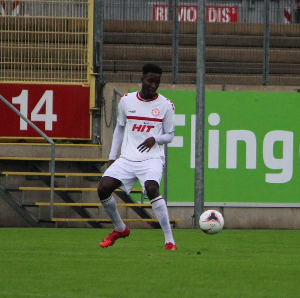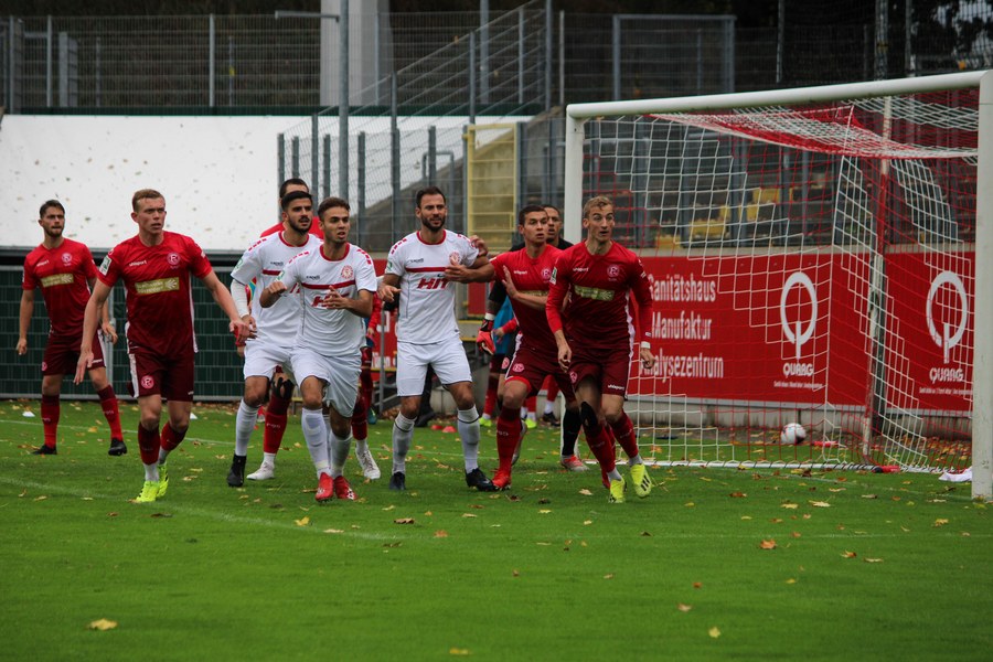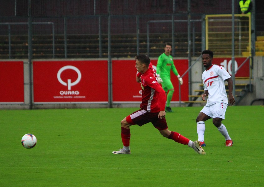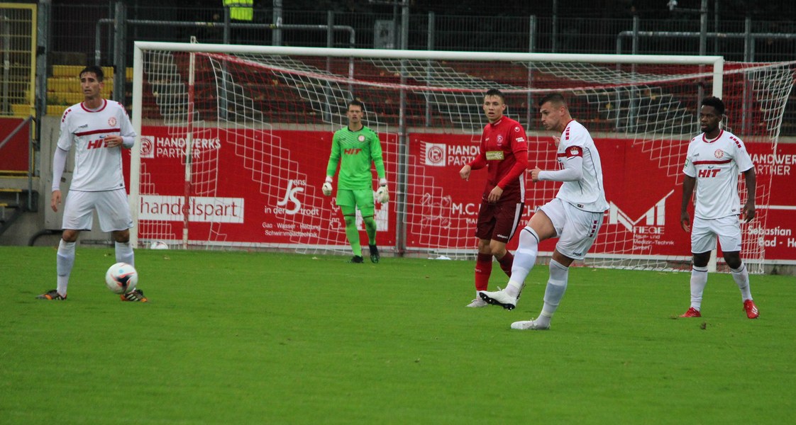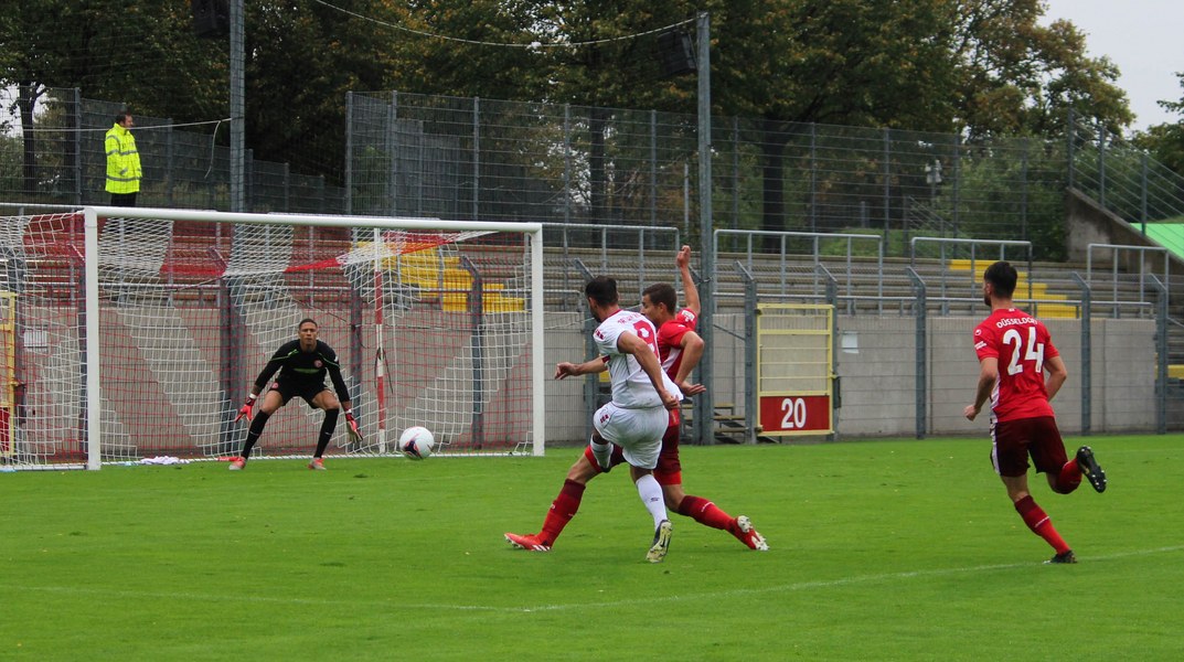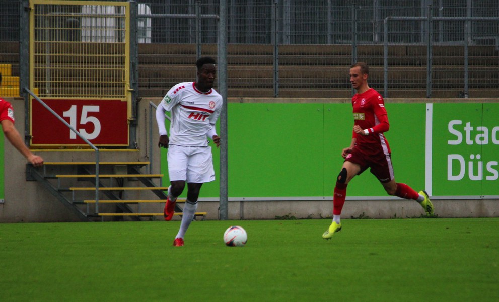 Zum Abschluss der englischen Woche ging es für Fortuna Köln zur U 23 von Fortuna Düsseldorf. In der verregneten Landeshauptstadt setzte Trainer Thomas Stratos auf die selbe Startelf, die am Mittwoch den Weg zum zweiten Saisonsieg ebnete. Doch kaum waren elf Minuten gespielt, da sah sich diese Elf bereits im Rückstand. Kevin Hagemann tankte sich über die rechte Angriffsseite in den Strafraum und hatte den Blick für den besser platzierten Appelkamp, der den zurückgelegten Ball zur frühen Führung der Gastgeber einschob (11.). Nur zwei Minuten später versuchte es der Torschütze aus der Distanz, zog seinen Schuss aber knapp über die Latte. Die Südstädter zeigten sich etwas beeindruckt von der Führung der Gastgeber und wartete weiter auf die schnellen Umschaltmomente. So wurde Koljic über die rechte Seite geschickt und brachte seine Flanke auf den ersten Pfosten, wo Düsseldorf vor Roman Prokoph klärte. Der getretene Eckball von Salman landete anschließend auf dem Kasten der Gastgeber (16.). Auch Ochojski hatte mit seinem Schuss aus der Distanz keinen Erfolg. Okoye hatte im ersten Versuch zwar Probleme, den Ball vor dem herbeieilenden Prokoph dann aber sicher. Die Kölner schüttelten sich und kamen immer besser in die Partie. Vor allem Aktivposten Mike Owusu leitete immer wieder gefährliche Situationen ein. Erst landete der Ball nach Owusu-Flanke bei Dennis Brock, der mit seinem Volleyabschluss an einem Düsseldorfer Rücken scheiterte (28.), dann bewies er einen feinen Fuß und bereitete den Ausgleich durch Salman vor. Owusu steckte auf Fortunas Nummer 10 durch, der den Ball trocken zum Ausgleich einschob (34.). Kurz vor der Pause gab es dann noch einen kurzen Schreckmoment für die Fortuna aus Köln. Appelkamp stand völlig blank an der Kante des Sechzehners und zog den Ball auf das Tor. Der Pfosten rettete für Rauhut, der dem Ball nur noch hinterherschauen konnte. Damit ging es mit dem Unentschieden in die Pause. Fortuna war wieder im Spiel.