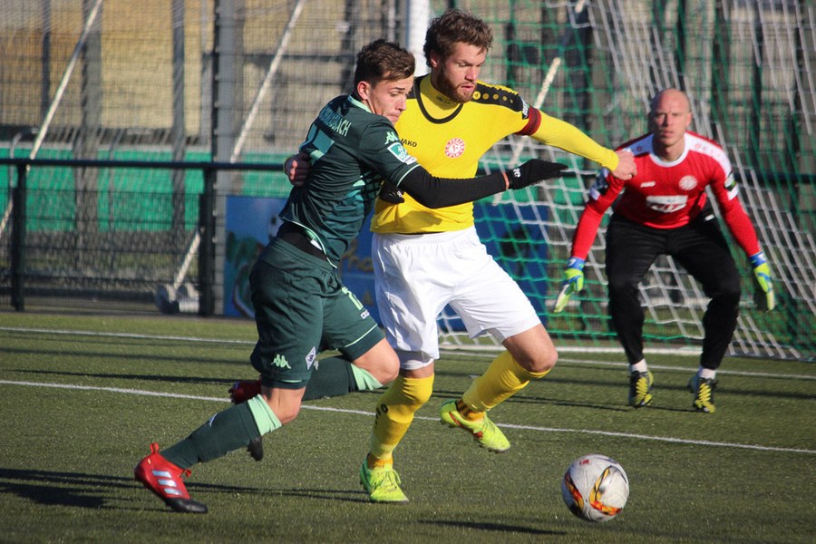 Die Fortuna ging den Test gegen Gladbach von Beginn an sehr seriös an. Auf Kunstrasen zeigten man sich mit Anpfiff aktiv und setzte die U23 früh unter Druck. Mit viel Kommunikation agierte man dabei als Team kompakt. Folgerichtig ging die Fortuna früh in Front, als man einen Ball gewann und Theisen aus der Distanz Keeper Moritz sehenswert überwand (4.). Die Fortuna ließ Gladbach kaum zur Entfaltung kommen und hatte mit Dahmani die nächste gute Chance (6.). Aus dem Nichts ließ man die U23 aber in die Partie, als man am Strafraum nicht entschlossen agierte. Yeboah nutzte das eiskalt mit einem platzierten Schuss in den Winkel (13.). Anschließend entwickelte sich ein offenes Spiel, in dem sich beide Teams zwischen den Strafräumen neutralisierten. Nach einer halben Stunde fuhr die Fortuna aber wieder hoch und attackierte wieder früh. Gladbach hatte nun Probleme, den Ball laufen zu lassen. Dahmani verbuchte dafür zwei schnelle Abschlüsse (31./34.). Folgerichtig ging die Fortuna wieder in Front: Nach einem schnellen Doppelpass belohnte sich Pazurek für einen starken Ballgewinn mit einem Tor und der erneuten Fortuna-Führung (37.).