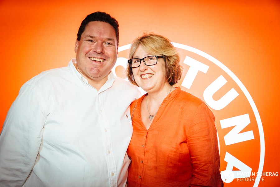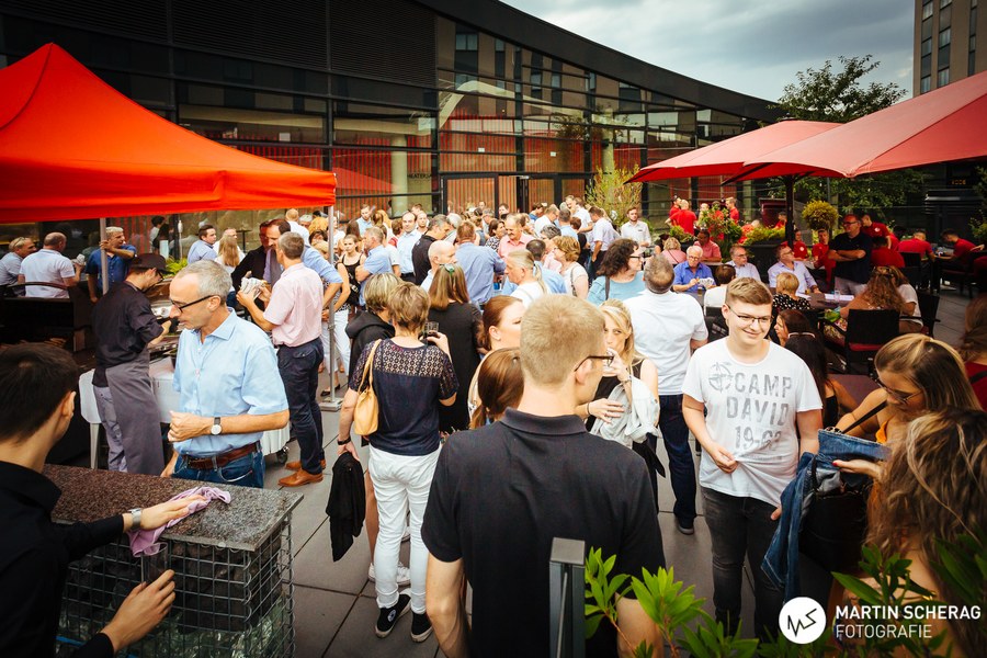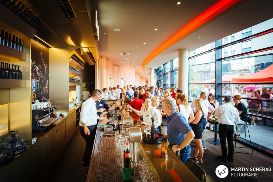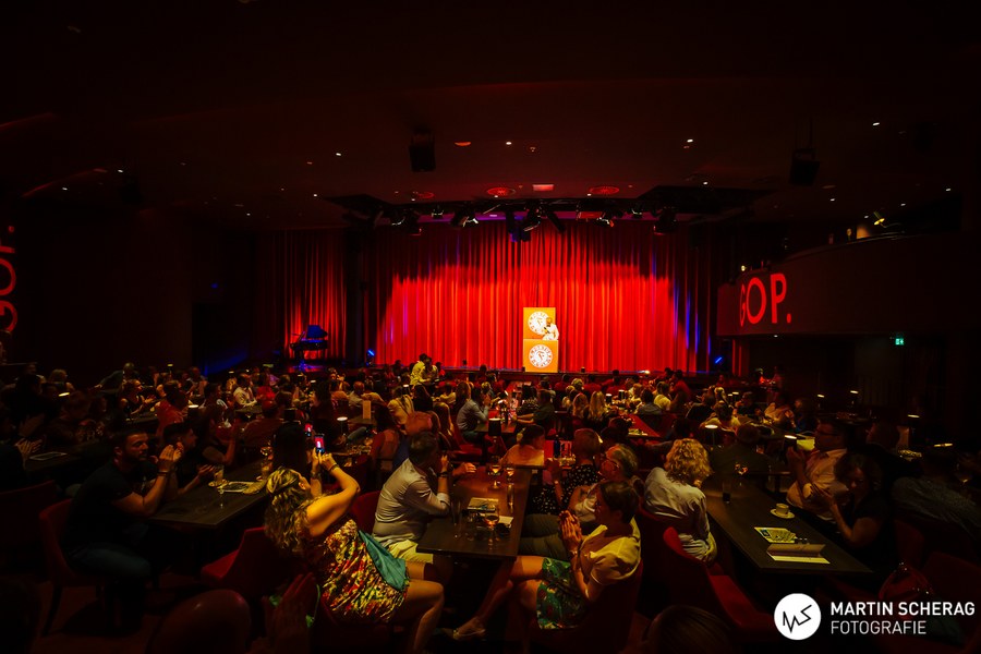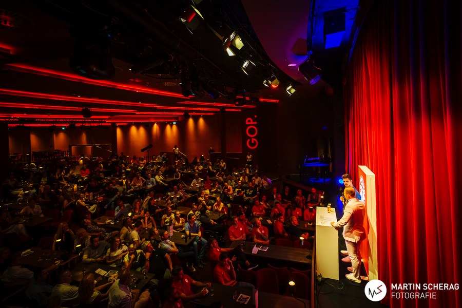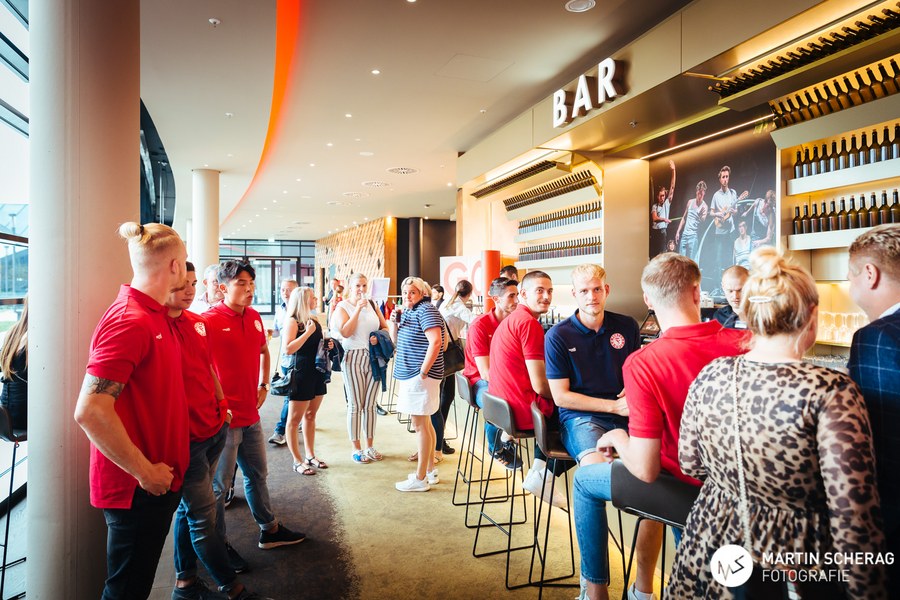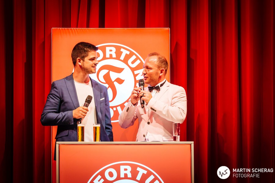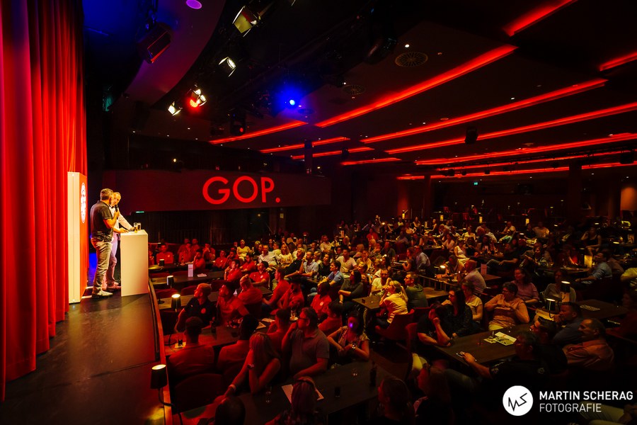 Der Startschuss für den Fortuna-Abend fiel um 18 Uhr. Nach einem kurzen Empfang durch das Team der Fortuna kamen die Gäste im Bar- und Terrassenbereich des Varietés zusammen und kosteten die GOP-Pfefferwurst, die für den Abend extra aus dem GOP in Hannover angeliefert wurde. Um 19 Uhr betraten die Gäste den Theatersaal. Der große Varieté-Saal bietet Platz für 400 Gäste und überzeugt mit einem gemütlichen Flair. Nach einer kurzen Begrüßung durch Fortuna-Geschäftsführer Benjamin Bruns übernahm der Gastgeber des Abends das Wort: Kevin Grote. Der Geschäftsführer des GOP-Varietés führt das Familienunternehmen in der nächsten Generation fort.