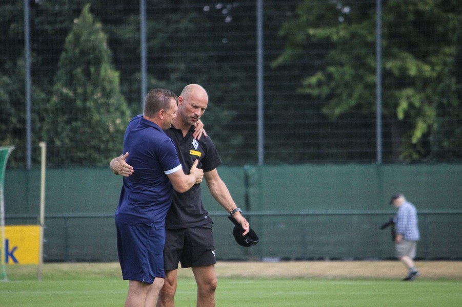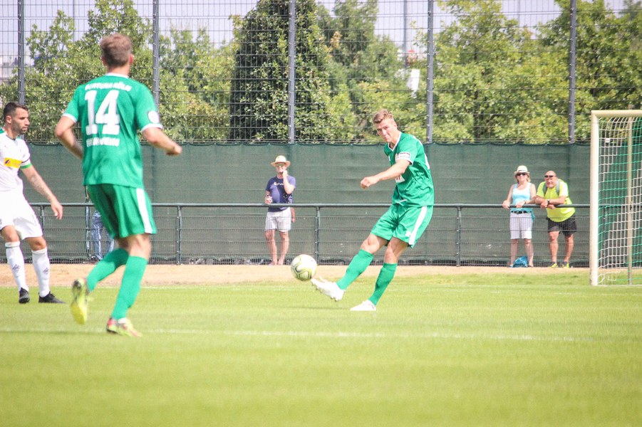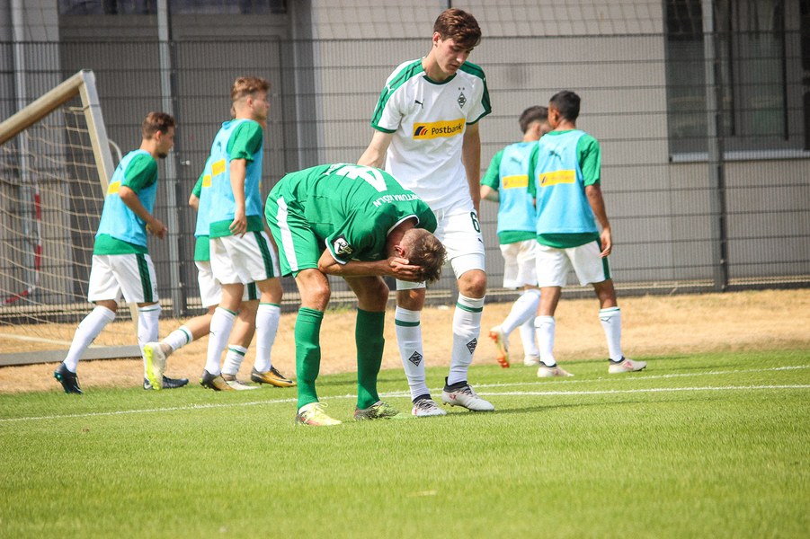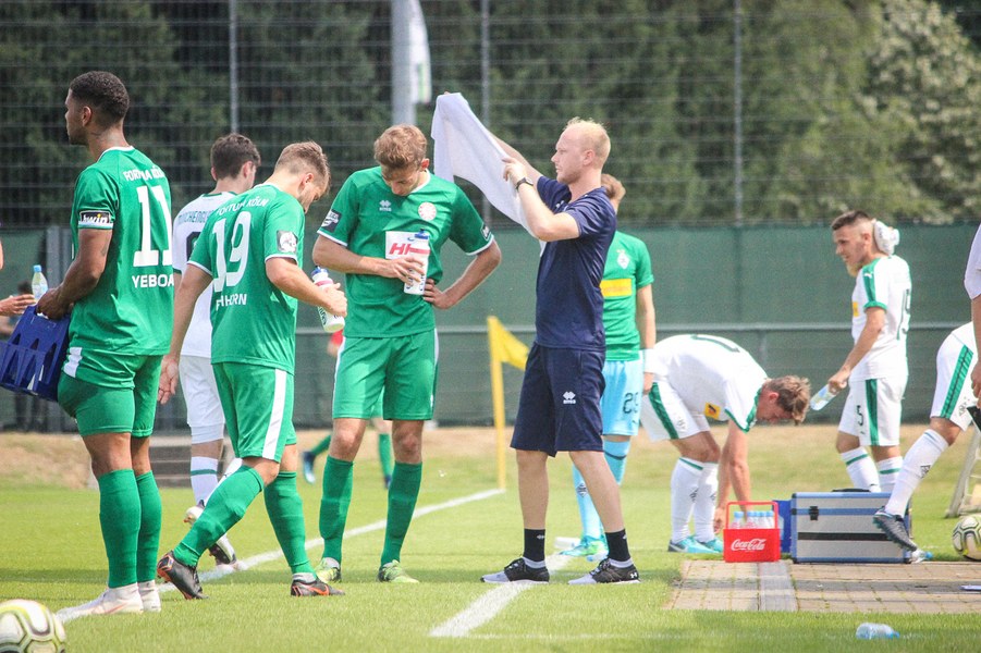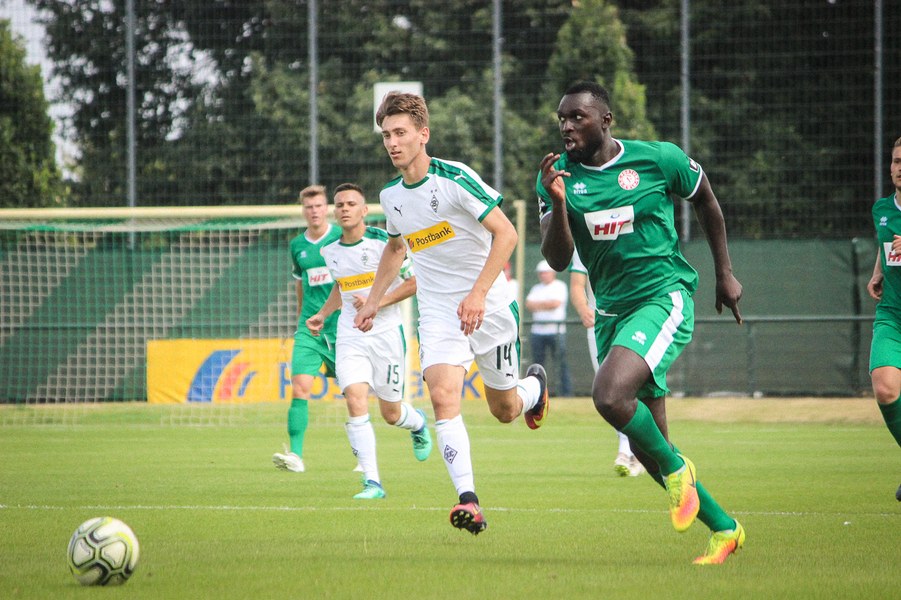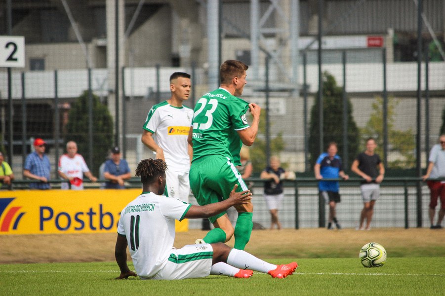 Trotz der heißen Temperaturen legten beide Mannschaften schon zu Beginn ein ambitioniertes Tempo an den Tag. So erspielten sie sich nach zehn Minuten auch immer wieder kleinere Chancen, die aber beide Seiten nicht entschlossen genug zuende spielten. Nach einer Viertelstunde konnte sich keine Mannschaft qualitativ von seinem Gegner absetzen, wodurch die Partie nach durchaus attrkativem Start etwas abflachte. Die beste Chance der Anfangsphase hatten die Gladbacher, als Kraus eine Hereingabe direkt nahm, sein Ball aber knapp über das Tor abgefälscht wurde (20.) In der Folge erspielte sich die Borussia Mitte der ersten Hälfte ein leichtes Chancenplus. Nach der kurzen Trinkpause fiel es den Spielern schwerer, wieder in die Partie zu kommen. Die Anzahl kleinerer Fouls nahm zu und die spielerische Komponente nahm etwas ab. So war es ein langer Ball auf Yeboah, der die Viererkette de Borussia überraschte und am Ende zur Führung der Fortuna führte, als Yeboah den Ball auf den im Zentrum vollstreckenden Hartmann querlegte (33.). Im Anschluss an den Treffer hatte die Fortuna zeitweise auch etwas mehr Kontrolle über das Spielgeschehen, konnte aber nicht weiter nachlegen. So ging es mit einer 1:0 Führung in die Pause.